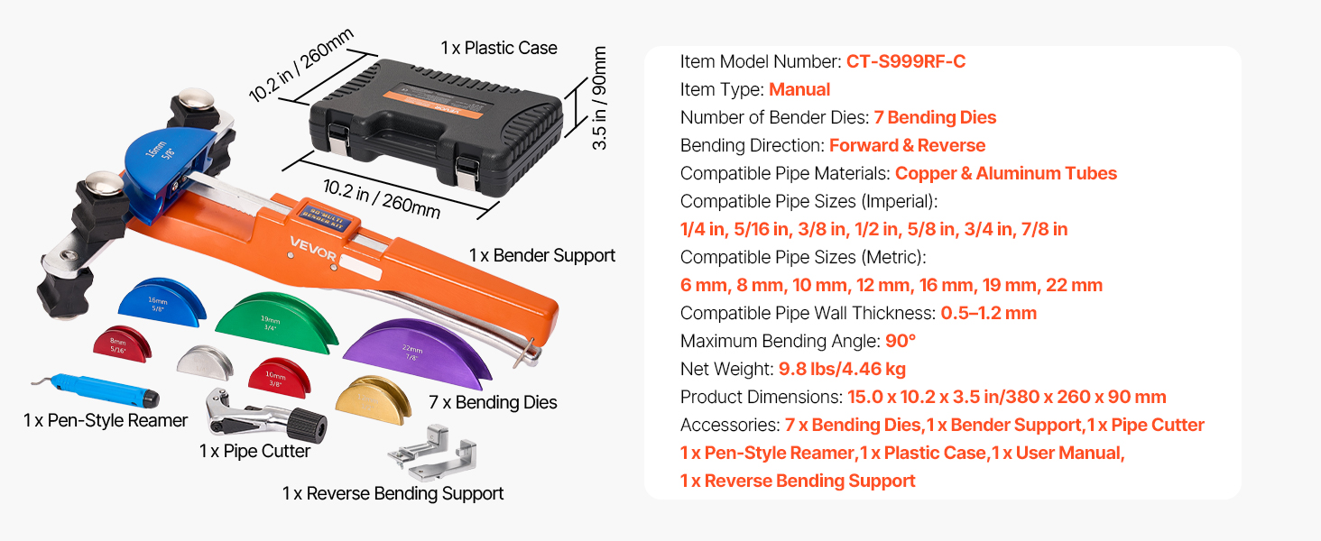 Tato ruční ohýbačka trubek s ráčnou se dodává se 7 maticemi, které umožňují přesné ohýbání měděných a hliníkových trubek o průměru od 1/4 palce do 7/8 palce (6 až 22 mm). S úhly ohybu od 0° do 90° je ideální pro instalaci klimatizace, opravy automobilů a použití v domácnosti. Díky kompaktnímu provedení se snadno přenáší a skladuje.