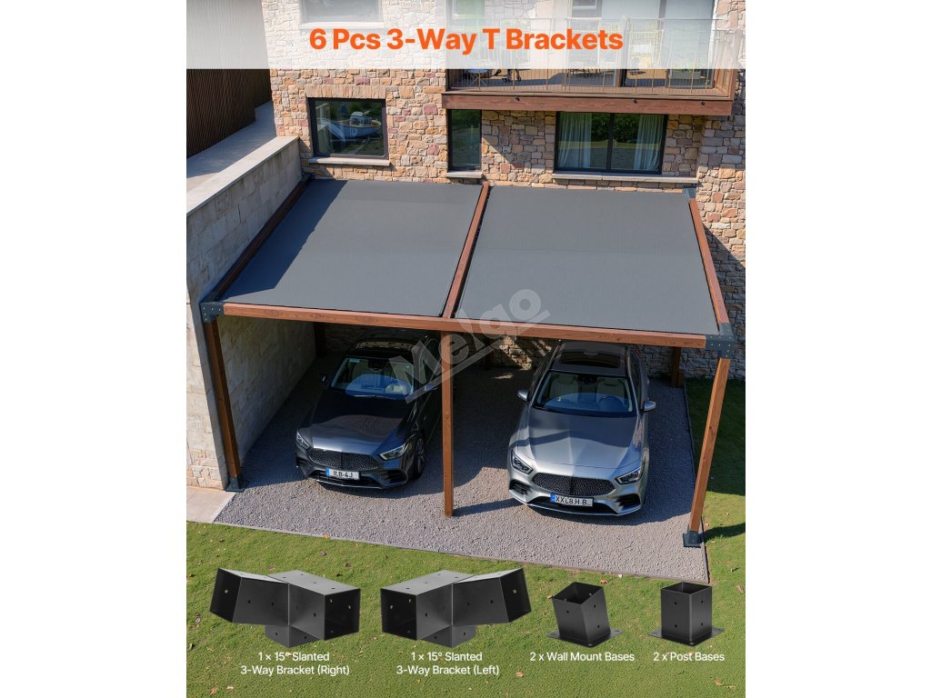 A1: Sada obsahuje dva úhlové čtyřcestné držáky, základnu pro zemní sloupek a základnu pro montáž na stěnu. Vhodná pro stavbu dvoupodlažní pergoly se šikmou střechou.