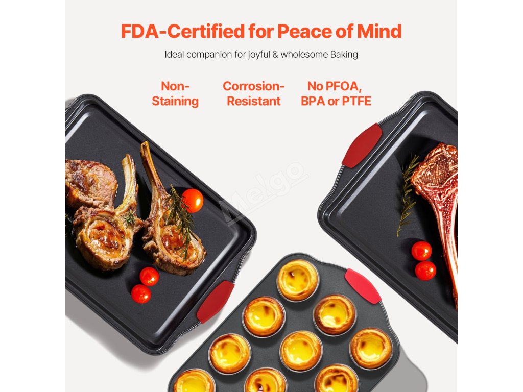 Tyto formy na pečení jsou vyrobeny z prvotřídních materiálů šetrných k tělu a neobsahují škodlivé látky, jako jsou PFOA, BPA a PTFE. Jsou odolné proti poškrábání, skvrnám a korozi, takže jsou lepší volbou pro zdravé pečení.