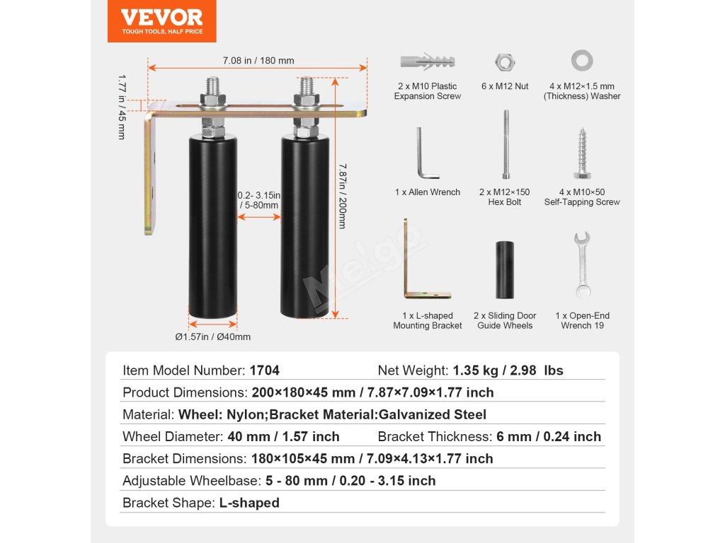 Tento vodicí systém posuvných dveří je vybaven odolným ocelovým držákem odolným proti korozi a dvěma nylonovými válečky pro hladký a tichý chod. Snadno se instaluje, je kompatibilní s různými kolejnicemi a zaručuje dlouhotrvající výkon bez nároků na údržbu.