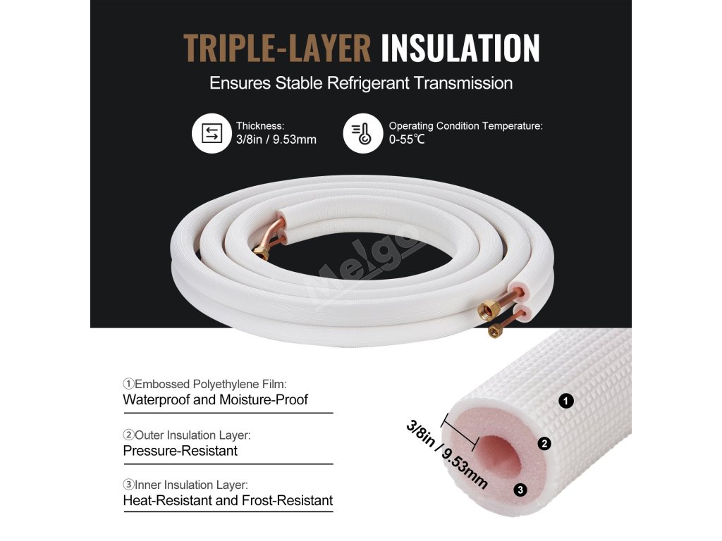 Pro lepší ochranu vnitřních měděných trubek používá VEVOR třívrstvé izolační materiály, které mají lepší izolační vlastnosti než běžné dvouvrstvé izolační materiály. Reliéfní povrchová úprava zvyšuje odolnost a představuje nepopiratelnou pevnost.