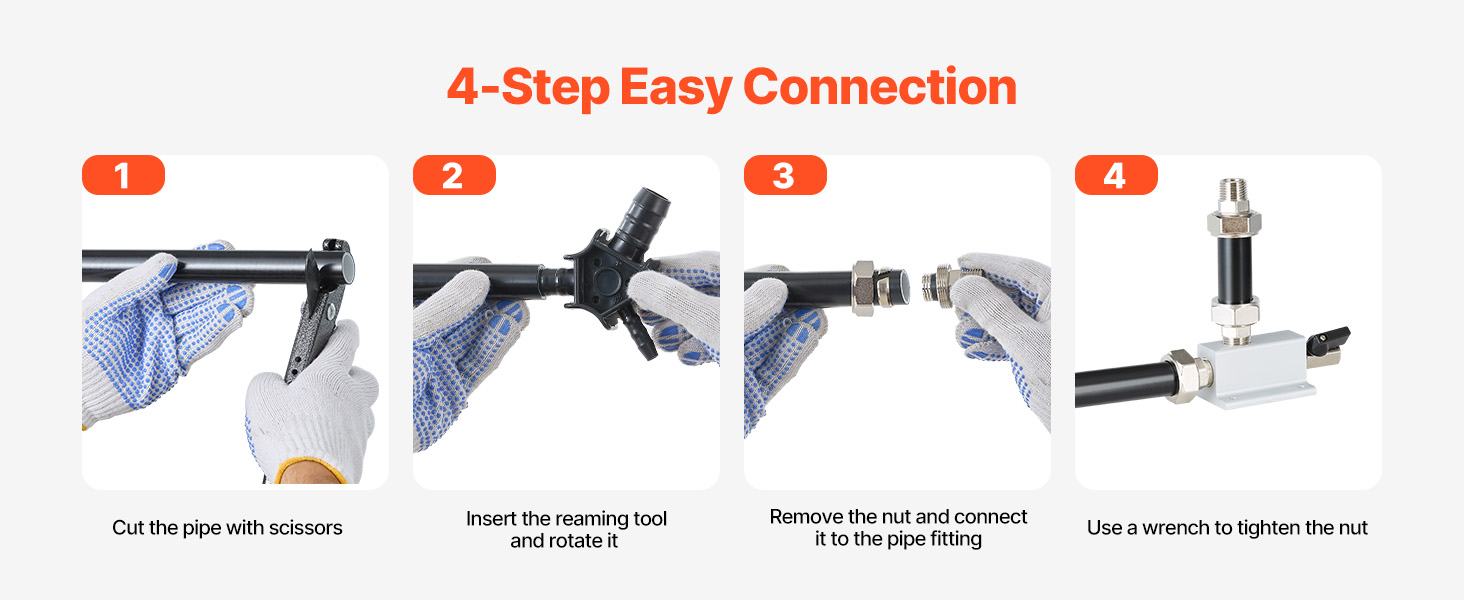 Naše sada vzduchového potrubí z HDPE a hliníku se dodává se všemi nástroji potřebnými k instalaci. Pro nastavení celého systému stlačeného vzduchu stačí postupovat podle jednoduchých pokynů - není třeba žádné další nářadí ani nákupy.