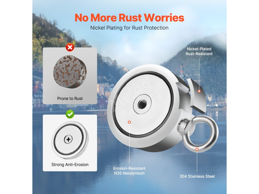 Rybářský magnet i příslušenství jsou vyrobeny z nerezové oceli nebo potaženy vrstvami odolnými proti korozi. Jsou vodotěsné, odolné proti oděru a účinně zabraňují znehodnocení, což zajišťuje větší trvanlivost. Nemusíte se obávat, že by vybavení ovlivnila rez nebo degradace.