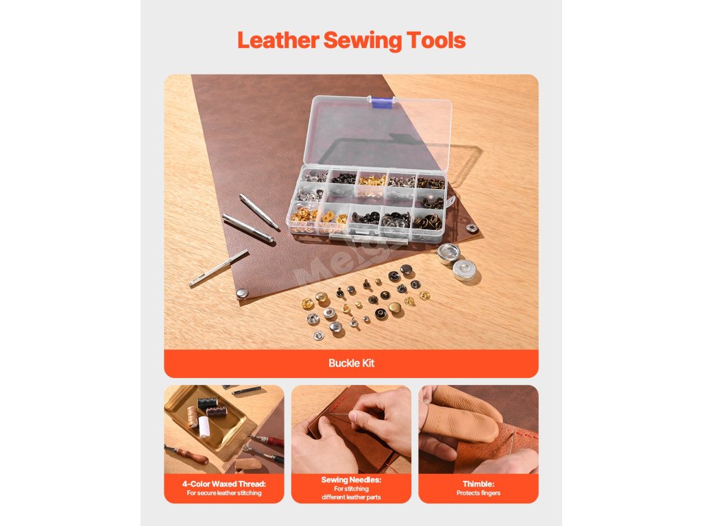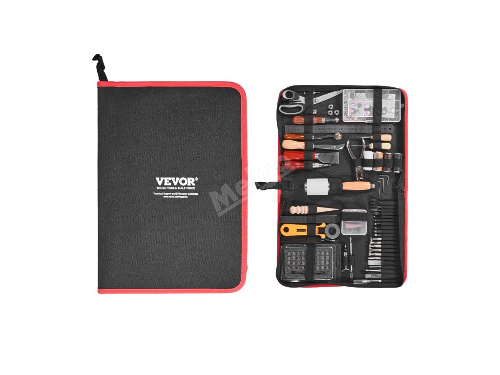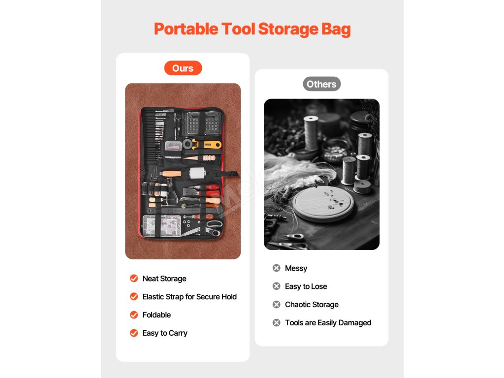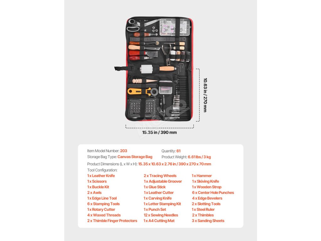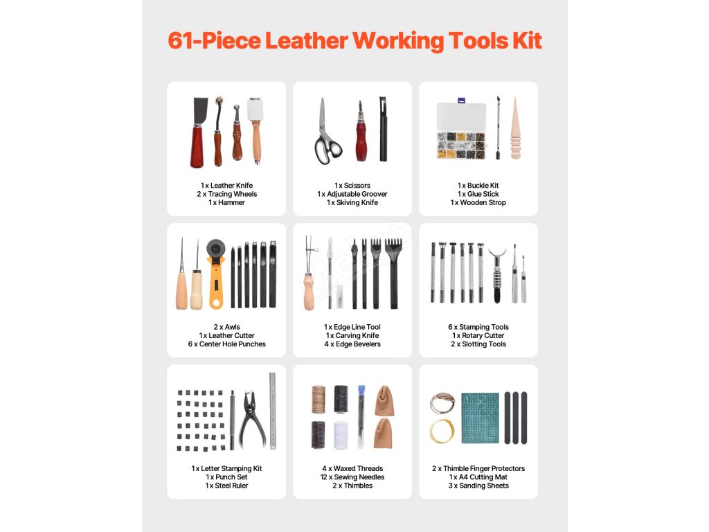 Tato 61dílná sada na zpracování kůže obsahuje vše, co potřebujete k děrování, stříhání, šití a vyřezávání. Je vyrobena z vysoce kvalitních materiálů pro dlouhou životnost a snadné použití. Dodává se také s praktickou úložnou taškou, abyste měli nářadí přehledně uspořádané a snadno se přenášelo.