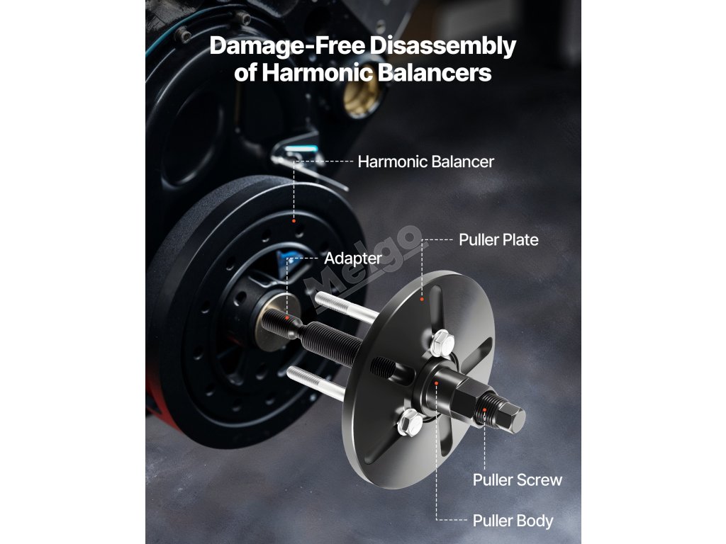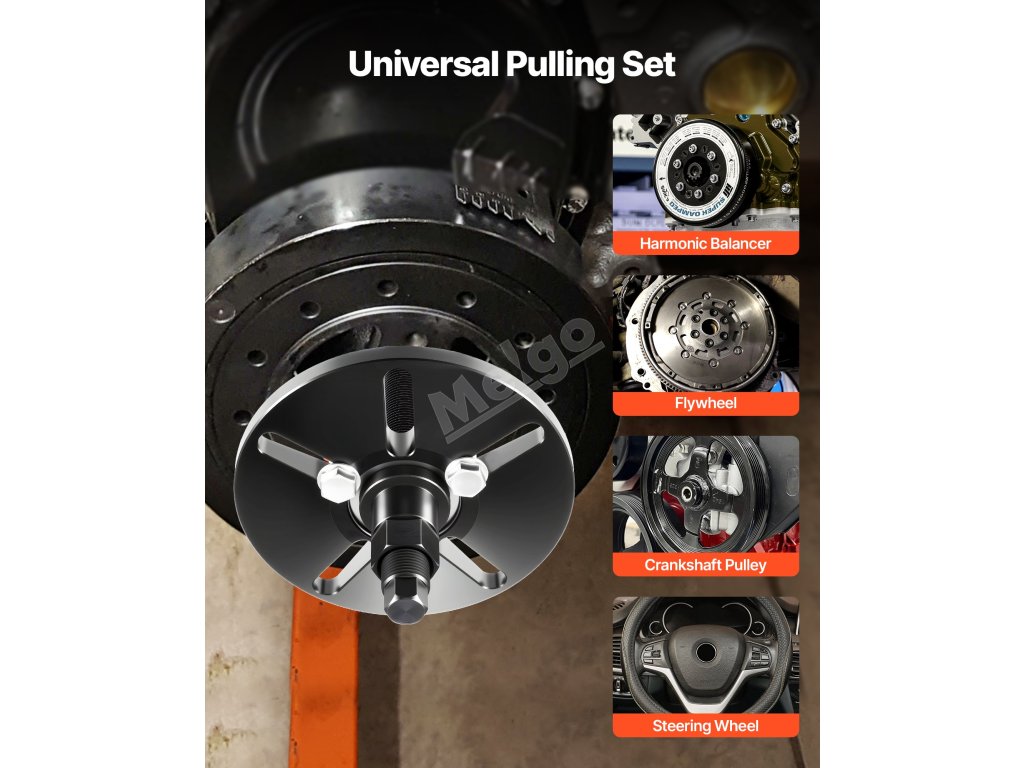 Sada stahováků harmonických vyvažovačů je ideální pro montáž a demontáž harmonických vyvažovačů, setrvačníků, řemenic klikového hřídele a kol řízení. Jedna sada, více úkolů - ideální pro profesionály i kutily.