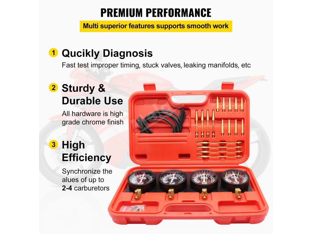 Veškeré kování má chromovanou povrchovou úpravu se stabilní strukturou a odolnou konstrukcí. Podtlakový karburátorový nástroj dokáže rychle diagnostikovat zaseknutý ventil, netěsnost sběrného potrubí a synchronizovat více údajů karburátoru.