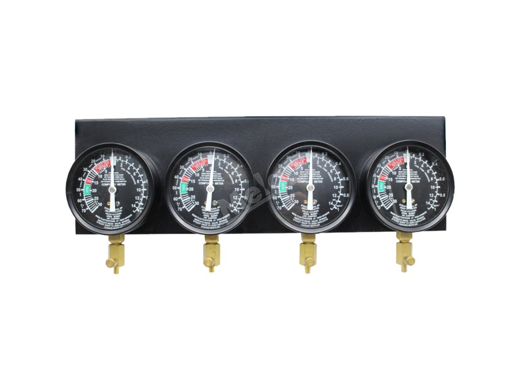 Tento výrobek obsahuje 4 mechanické tlakoměry vybavené 15,6" kovovou deskou, 4 uzavíratelné mosazné ventily a barevně odlišené stupnice pro pohodlné pozorování.