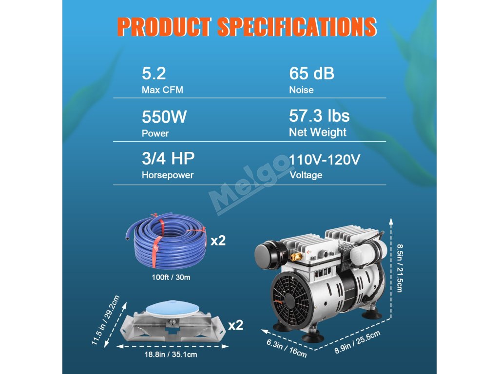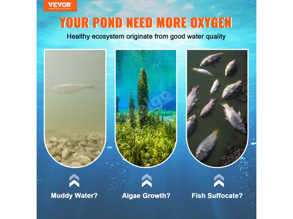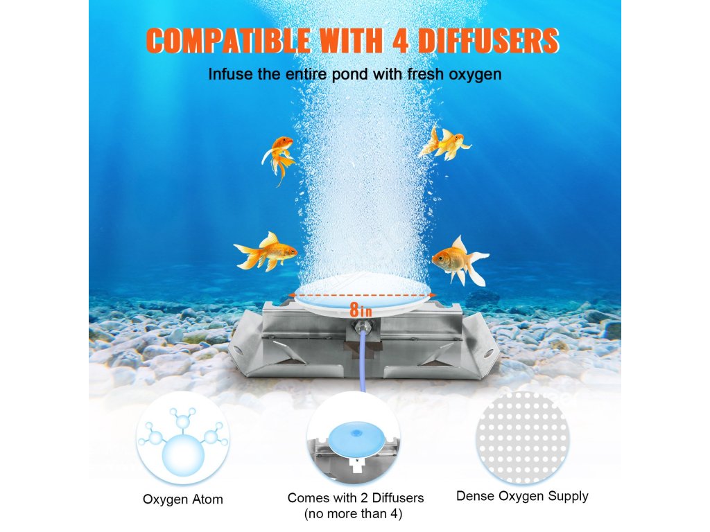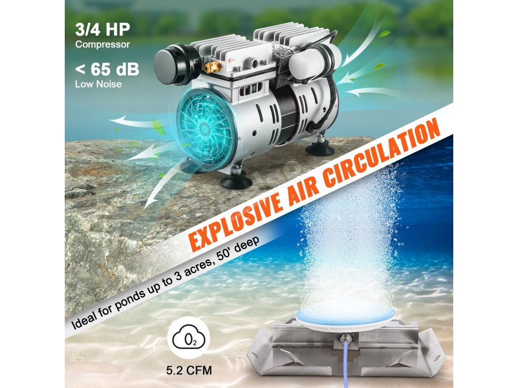 Provzdušňovač rybníků dokáže provzdušnit rybníky o velikosti až 3 akry a hloubce 50 stop. Dokáže čerpat maximálně 5,2 CFM vzduchu, čímž zajistí dostatek kyslíku pro vaše jezírka a rybníky.