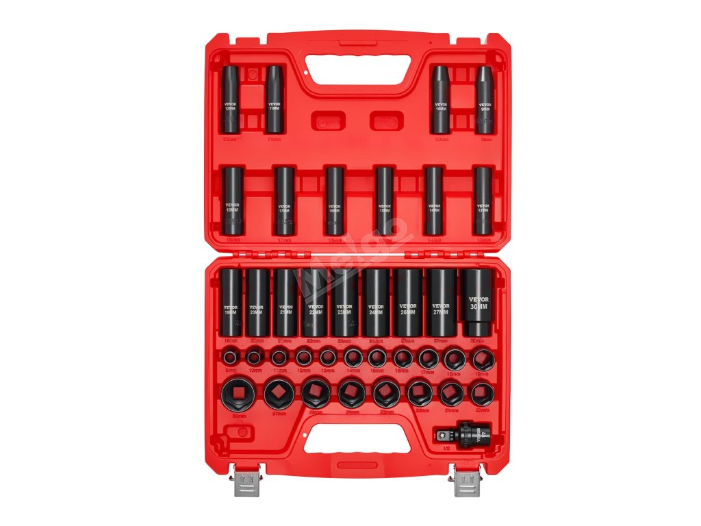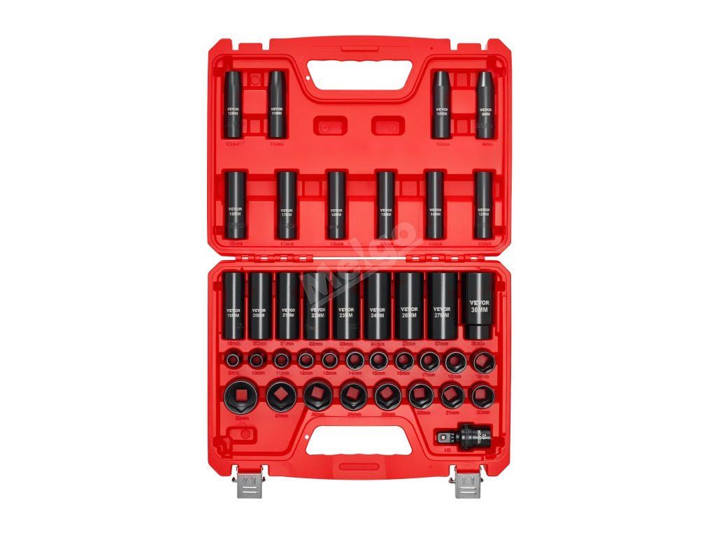 Sada rázových hlavic 1/2 in, 39 ks, 6-bodové, 9-30 mm, cr-v, kloub