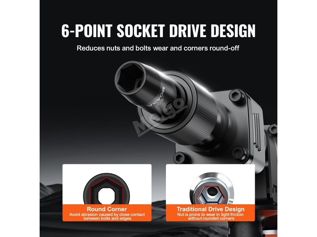 Šestihranná konstrukce nástrčné hlavice vytváří při práci mezeru mezi maticí a okraji, což zabraňuje nadměrnému tření a opotřebení. Odolává větší nárazové síle a účinně odstraňuje šrouby.