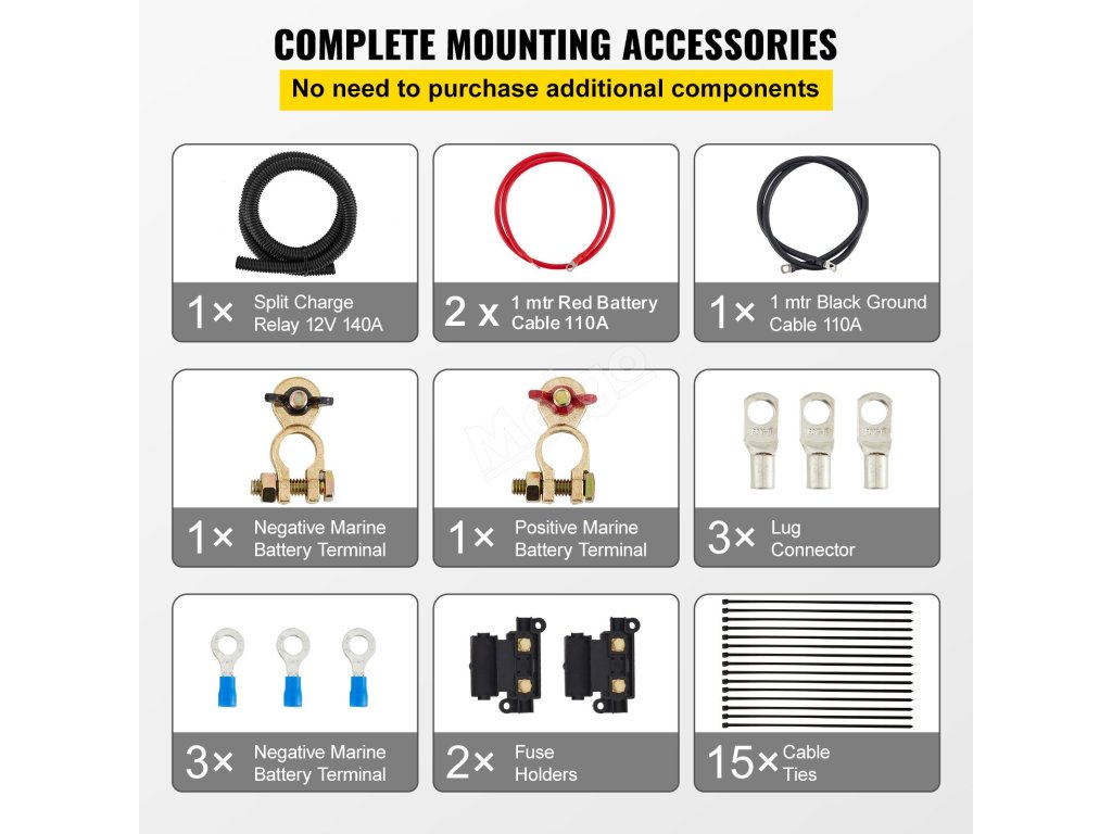 Sada relé děleného nabíječe se dodává se všemi díly potřebnými pro kompletní instalaci, včetně šroubů, kabelových vazeb atd.