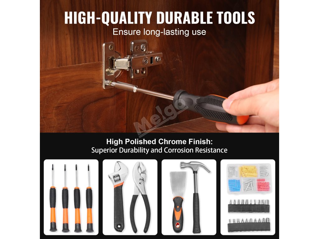 Naše sada nářadí pro domácí kutily je vyrobena z prvotřídní oceli a leštěna vysoce chromovanou povrchovou úpravou, což zaručuje pevnost, trvanlivost a odolnost proti korozi pro bezproblémové používání.