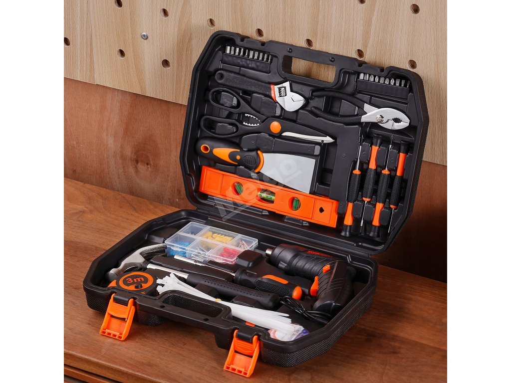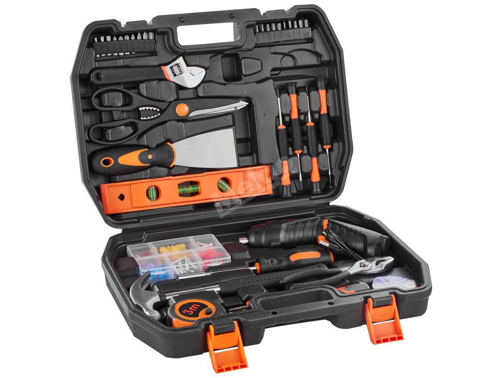 Tato sada obsahuje 96 nástrojů od kladiv přes šroubováky, kleště až po měřicí pásky, které jsou připraveny pro různé opravy v domácnosti, kutilské projekty a údržbu automobilů.
