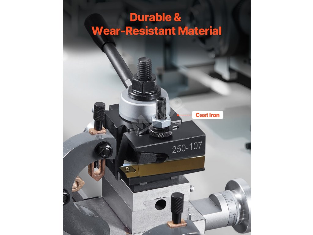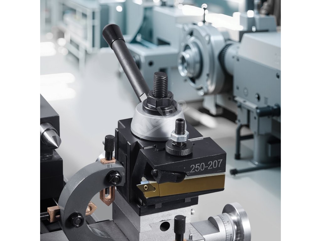 Tento rychlovýměnný držák nástrojů na soustruhu umožňuje bezpečné zajištění nástroje pouhým otočením rukojeti. Zefektivňuje výměnu nástrojů při zachování stability a spolehlivosti.
