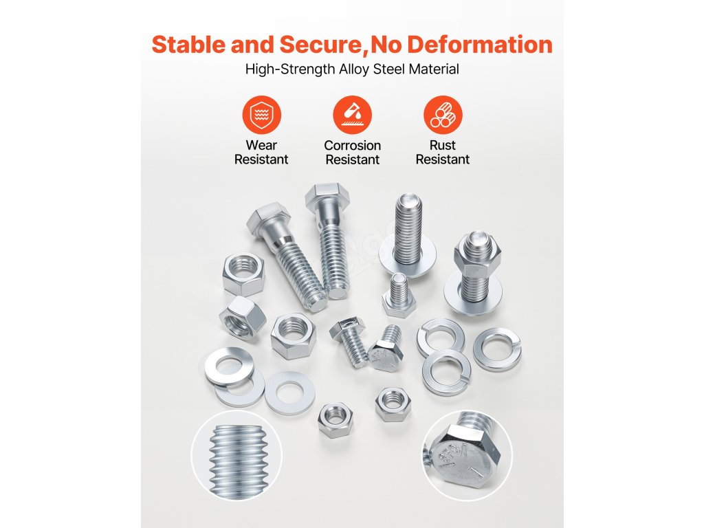 Díky širokému výběru šroubů, matic, podložek a dalších součástí různých velikostí poskytuje tato sada pevná spojení pro různé materiály a usnadňuje nalezení správných dílů pro vaši práci.