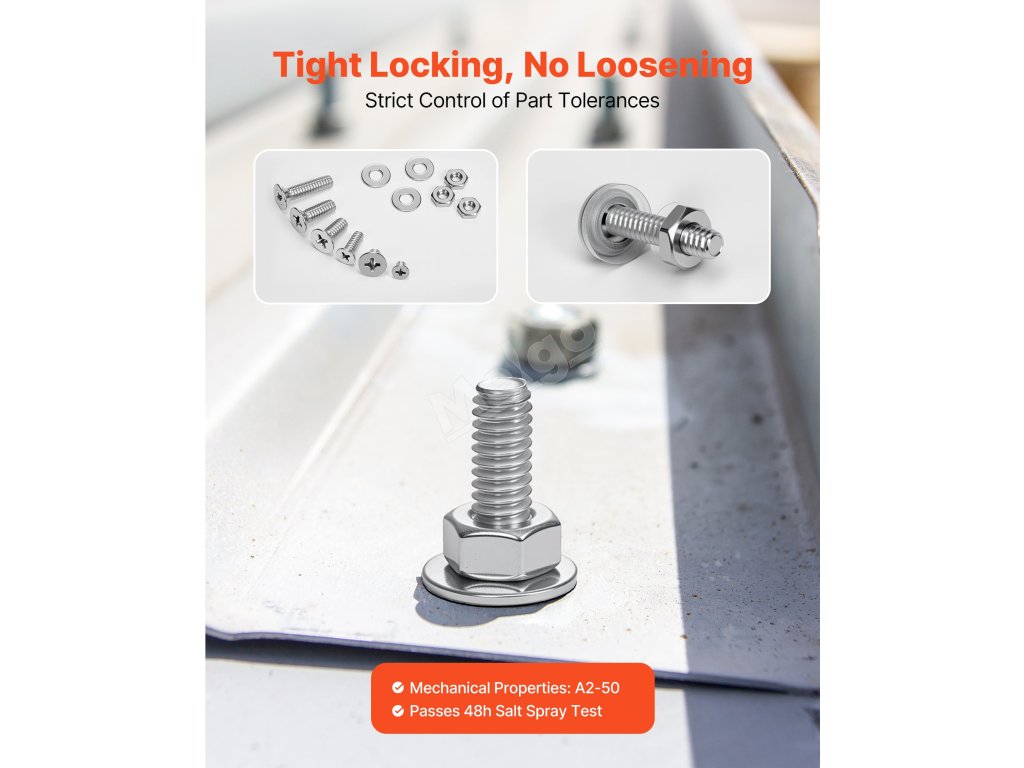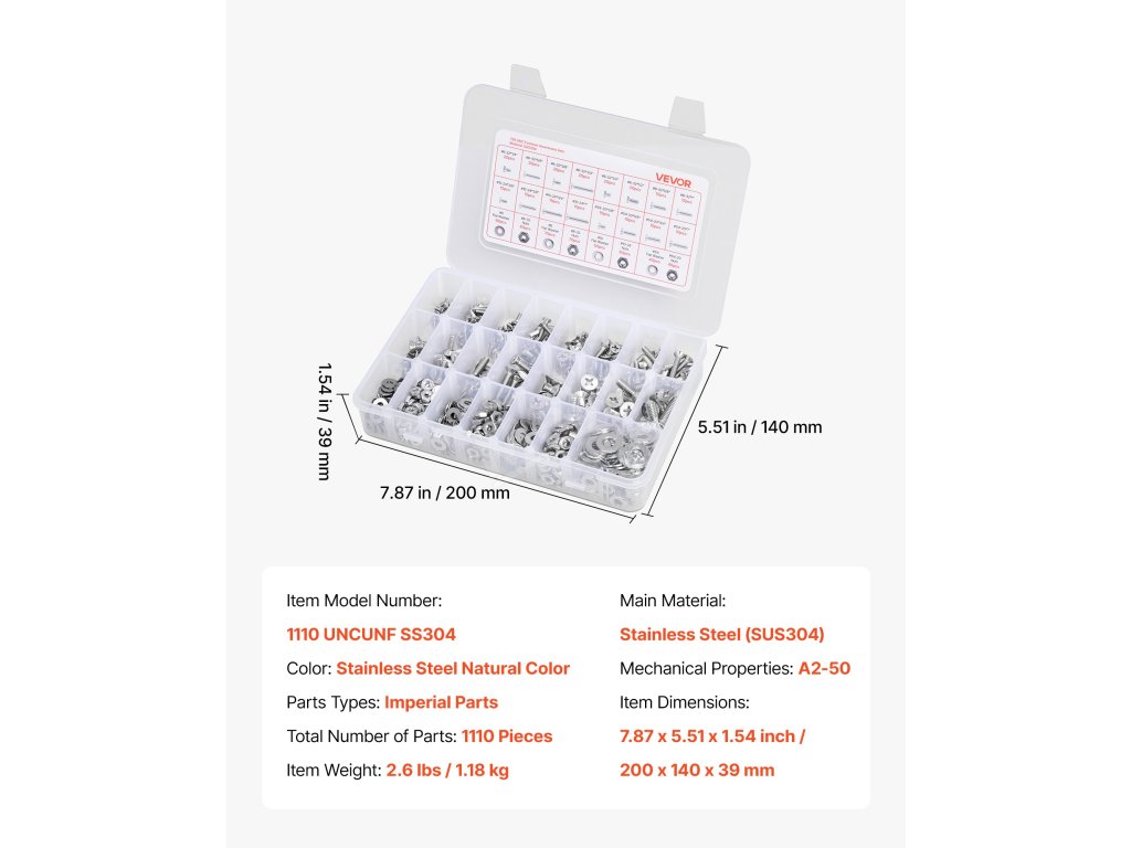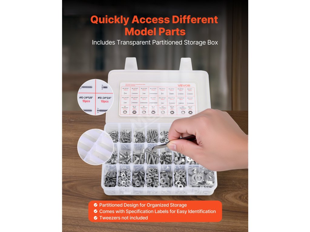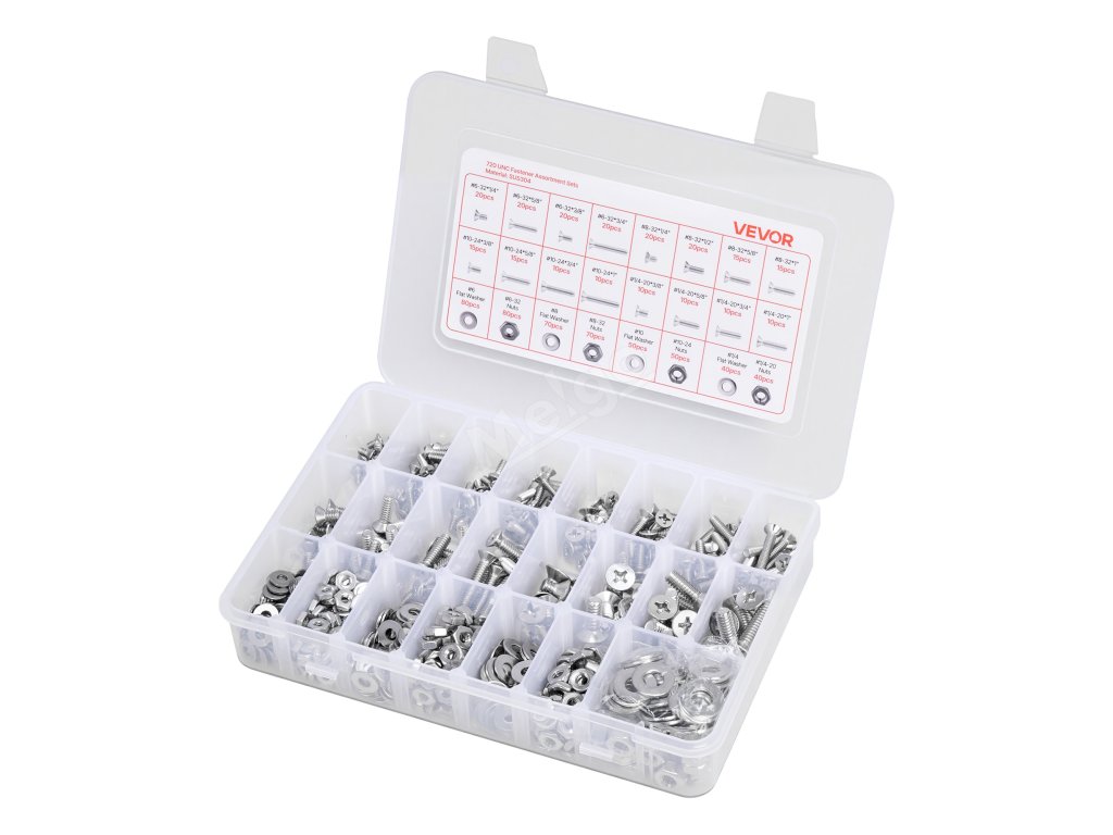 Díky širokému výběru šroubů, matic, podložek a dalších součástí různých velikostí poskytuje tato sada pevná spojení pro různé materiály a usnadňuje nalezení správných dílů pro vaši práci.