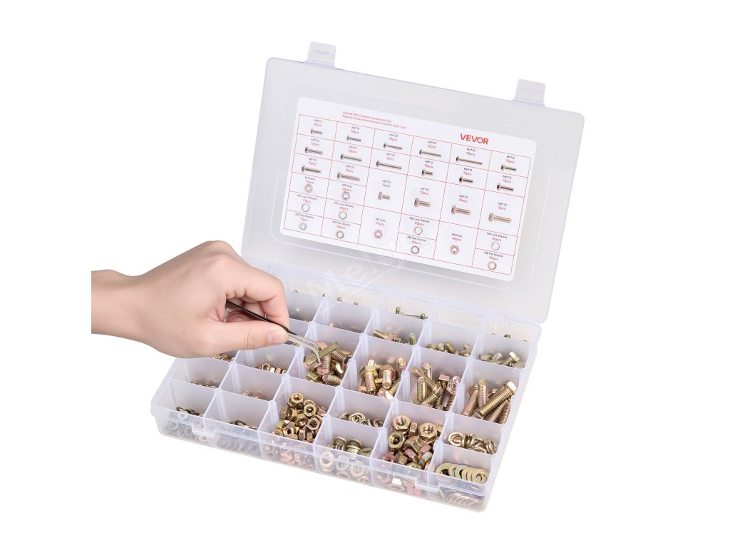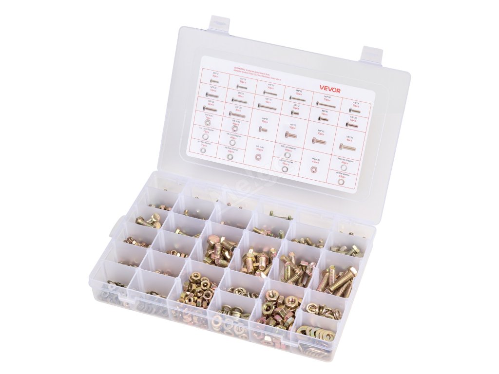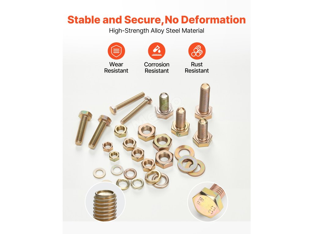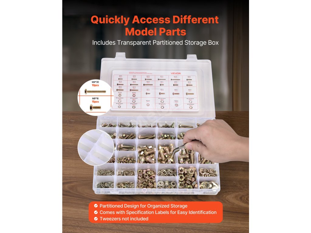 Díky širokému výběru šroubů, matic, podložek a dalších součástí různých velikostí poskytuje tato sada pevná spojení pro různé materiály a usnadňuje nalezení správných dílů pro vaši práci.