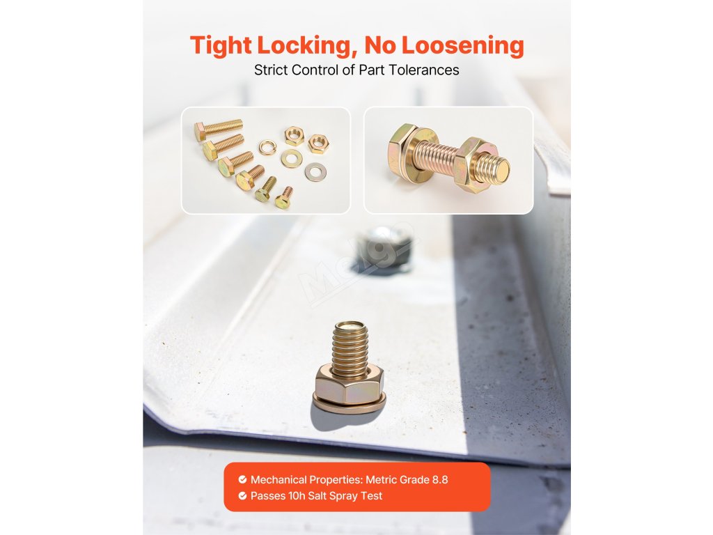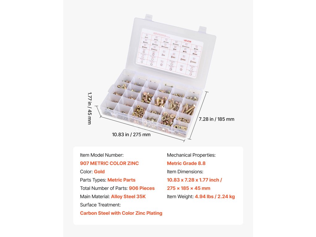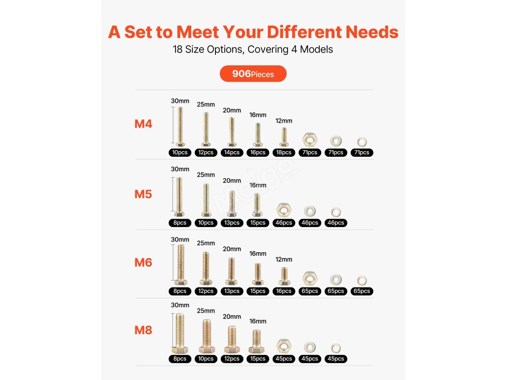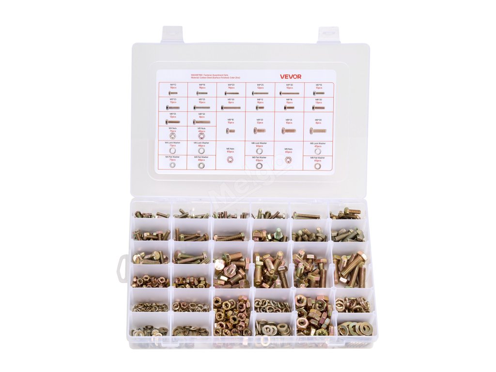 Díky širokému výběru šroubů, matic, podložek a dalších součástí různých velikostí poskytuje tato sada pevná spojení pro různé materiály a usnadňuje nalezení správných dílů pro vaši práci.