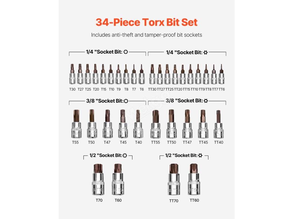 Sada torx bitů a hlavic 34 dílů t6–t70 s2/cr‑v 1/4/3/8/1/2 in
