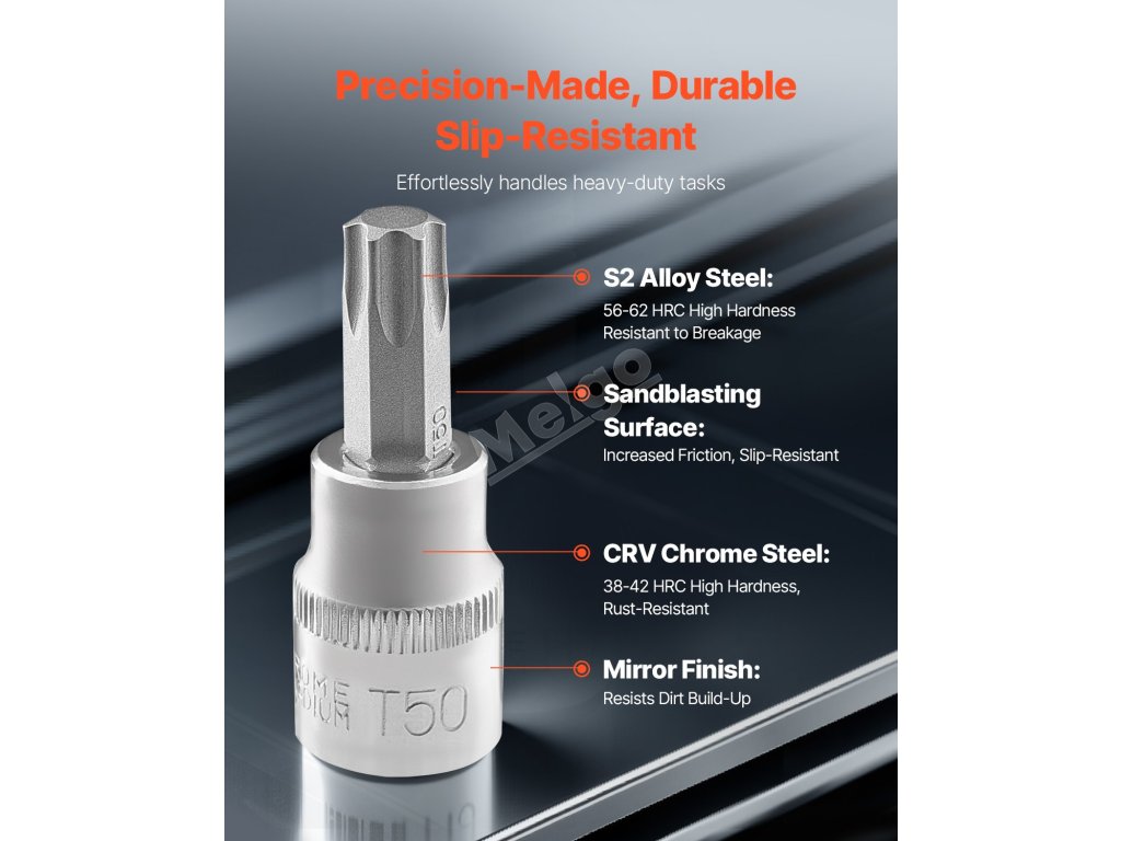 Sada nástrčných hlavic Torx je vyrobena z vysoce pevné legované oceli a je navržena tak, aby se při použití nelámala, což snižuje riziko nehod při opravách. Povrchová úprava bitů, vytvořená tak, aby odolávala korozi, zajišťuje pevný úchop a zabraňuje prokluzování při použití vysokého točivého momentu.