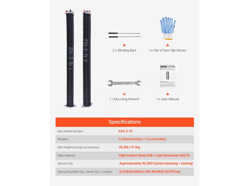 Sada torzních pružin na garážové dveře 0.234×2×31 in, 16000 cyklů