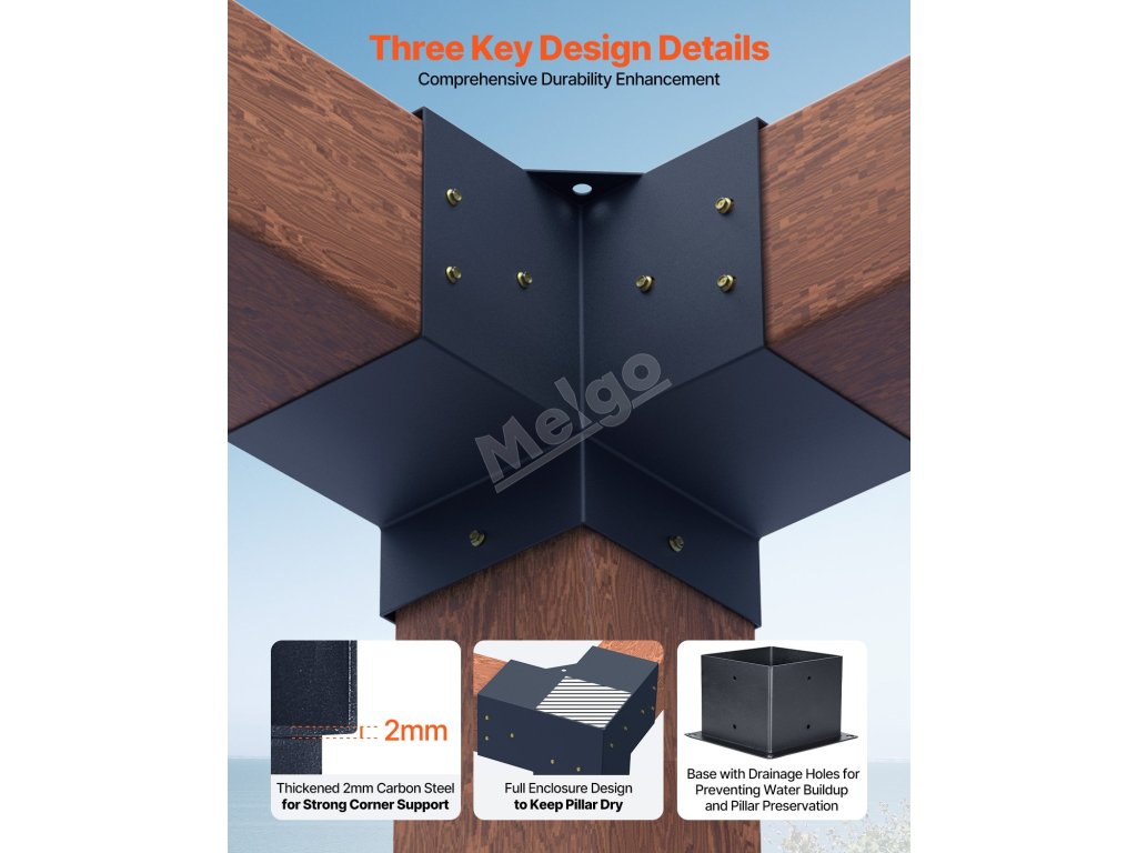 Naše třícestné držáky pergoly jsou odolné a robustní a jsou navrženy tak, aby chránily dřevěné trámy před dešťovou vodou a ostrým slunečním světlem.