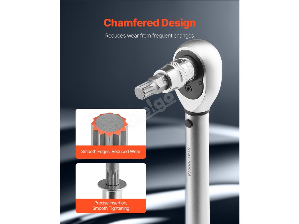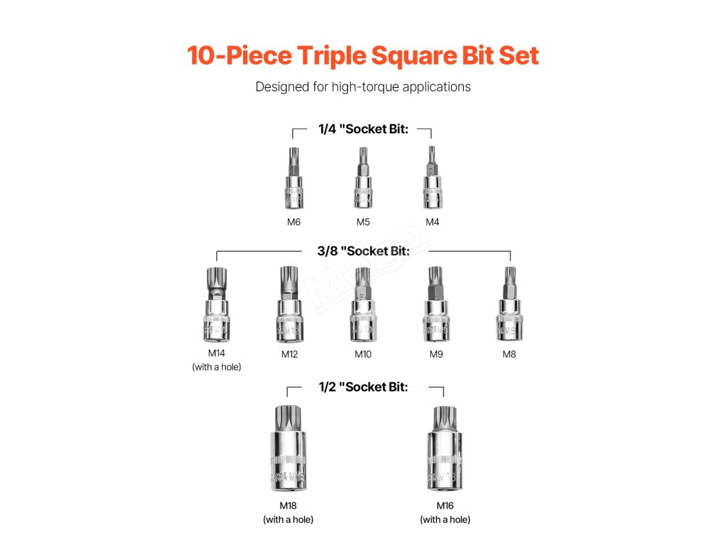 Sada trojitých čtyřhranných bitů je vyrobena z vysoce pevné legované oceli a je navržena tak, aby se při použití nelámala, což snižuje riziko nehod při opravách. Povrchová úprava bitů, vytvořená tak, aby odolávala korozi, zajišťuje pevný úchop a zabraňuje prokluzování při použití vysokého točivého momentu.