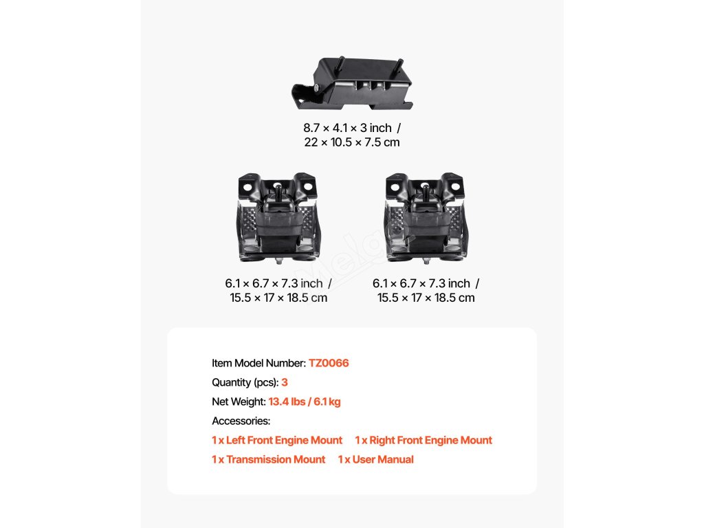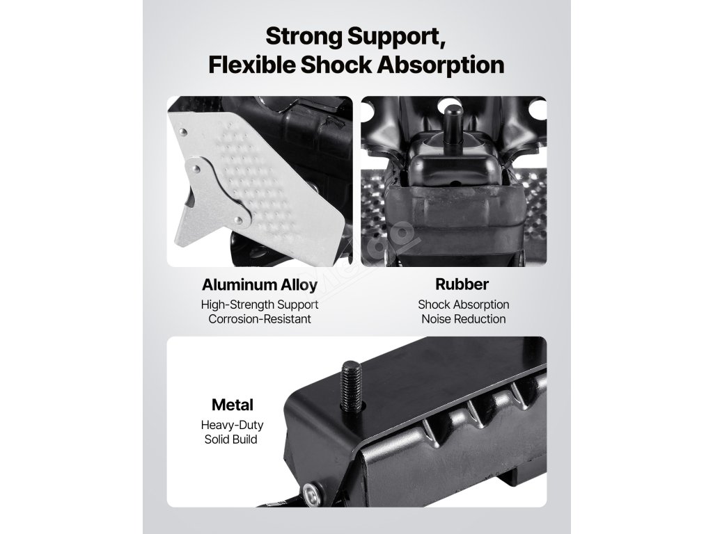 Tato sada držáků motoru je přesně navržena tak, aby odpovídala původním rozměrům vozidla, s přesným rozmístěním otvorů. Je vyrobena z robustního kovu a pryže a představuje spolehlivou náhradu držáku motoru, která tlumí nárazy a snižuje hluk, čímž zajišťuje bezpečnost a ochranu motoru.