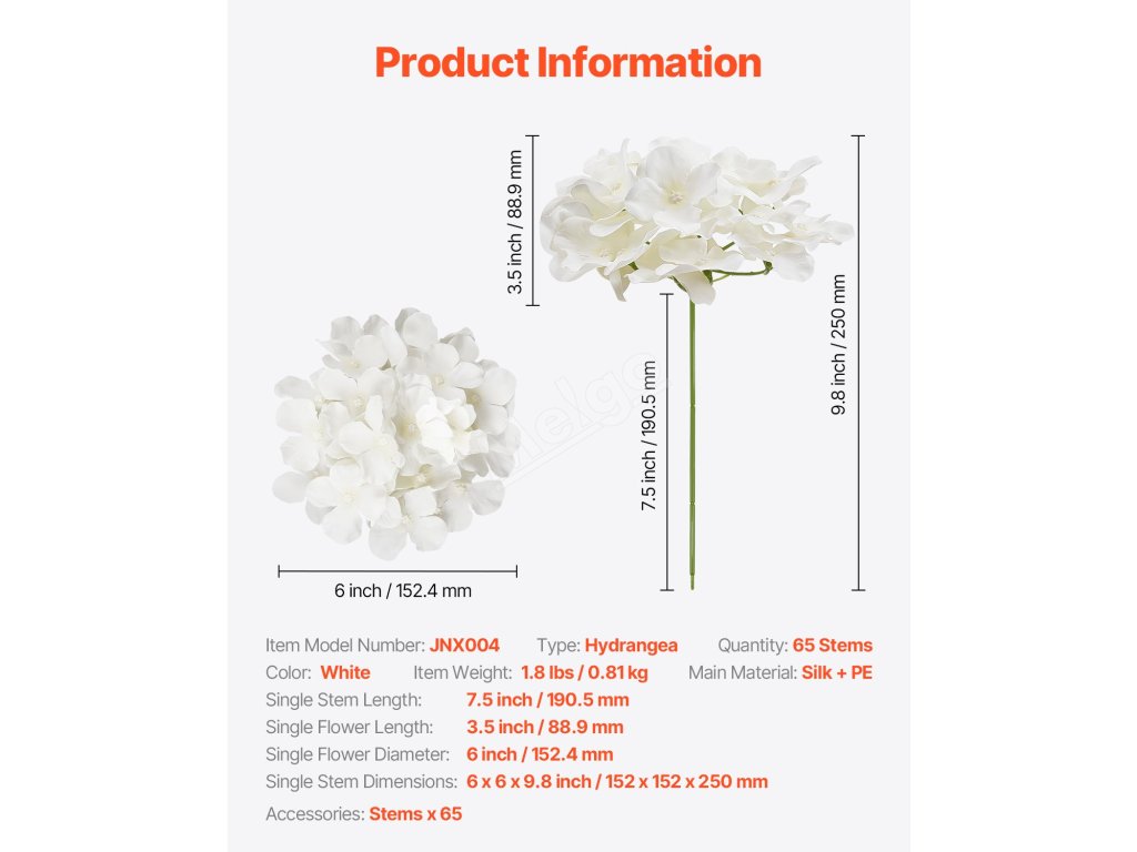 Sada obsahuje 65 bielych umelých hortenzií, z ktorých každá má 27 okvetných lístkov pre realistický kvet. Kvety sú 9,8" vysoké so 6" hlavami, vyrobené z hodvábu, ktorý nevybledne. Ohybné stonky umožňujú jednoduché ohýbanie a zastrihávanie pre domácich majstrov. Nenáročné na údržbu - stačí oprášiť, aby boli krásne. Ideálne na svadby, večierky a domáce dekorácie.
