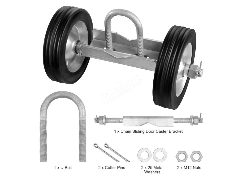 Tato sada těžkých řetězových posuvných dveří má odolná ocelová a gumová kolečka, která unesou až 600 kg. Vroubkovaný design zlepšuje přilnavost a stabilitu a zajišťuje hladký chod. Sada je kompatibilní s různými rámy a kolejnicemi se snadnou instalací.