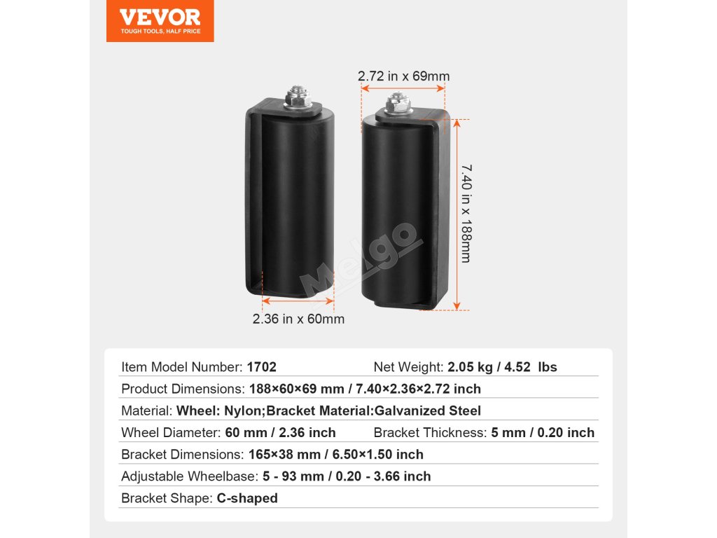 Tento vodicí systém posuvných dveří je vybaven odolným ocelovým držákem odolným proti korozi a dvěma nylonovými válečky pro hladký a tichý chod. Snadno se instaluje, je kompatibilní s různými kolejnicemi a zaručuje dlouhotrvající výkon bez nároků na údržbu.