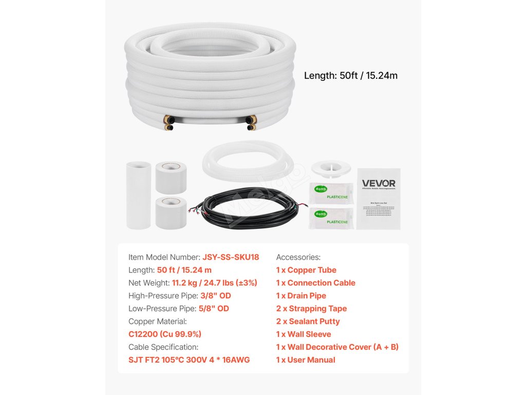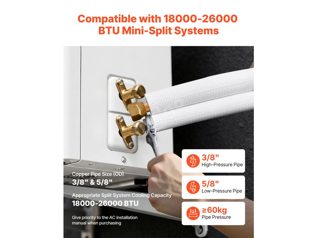 Sada je kompatibilní s mini-split klimatizačními jednotkami. Vysoce čisté trubky jsou odolné proti zalomení a netěsnosti, ideální pro instalaci v garáži nebo dílně. Obsahuje páskovací pásku a veškeré příslušenství k okamžitému použití. Snadná instalace vyžaduje pouze základní dovednosti s nářadím pro připojení vnitřní a venkovní jednotky.