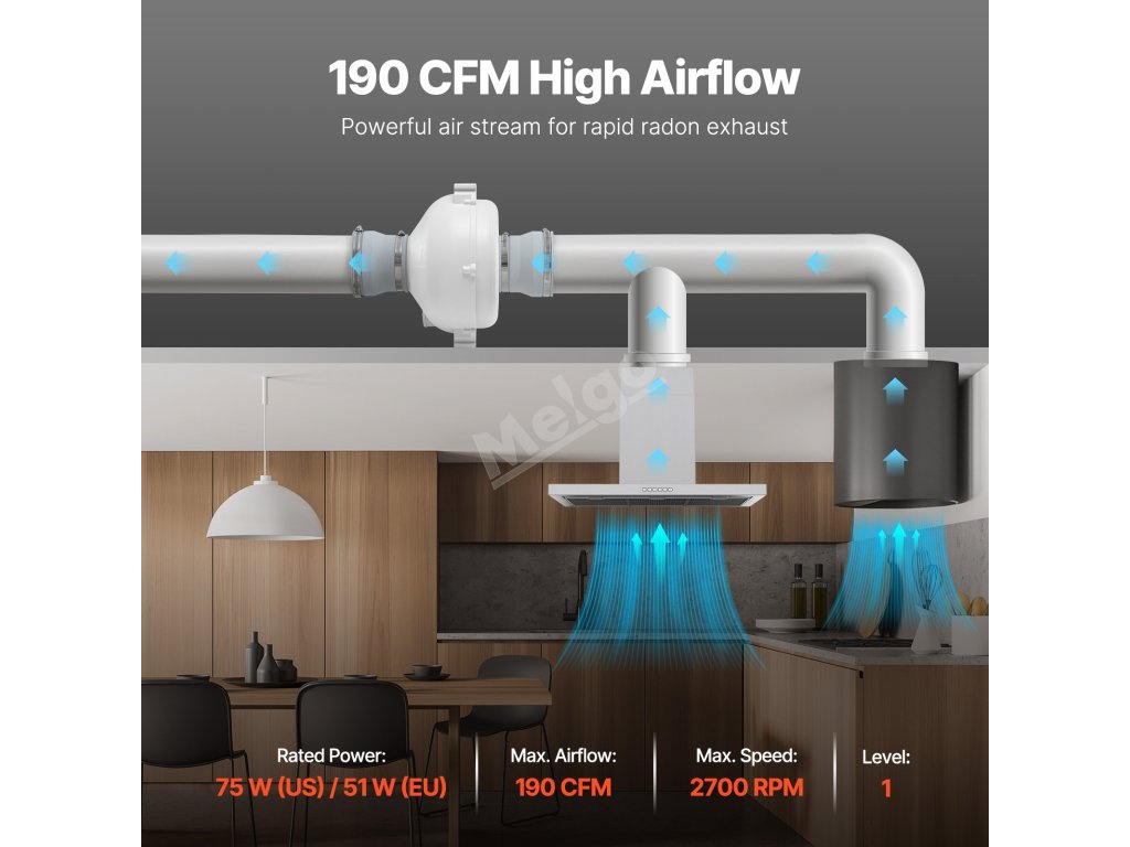 S prietokom vzduchu 190 CFM tento radónový ventilátor rýchlo znižuje hladinu plynu radónu v interiéri, čím zabezpečuje zdravé prostredie na dýchanie pre vašu rodinu.