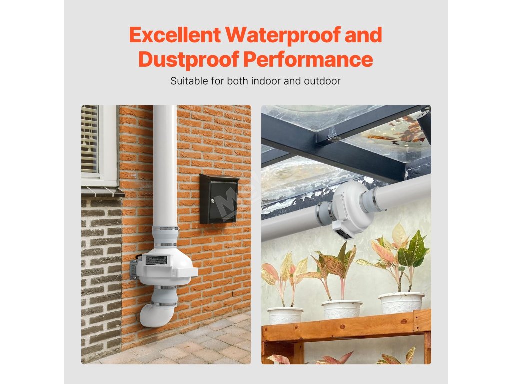 Sada ventilátoru proti radonu 4–4.5 inch, 190 CFM, 2 spojky, vodotěsný