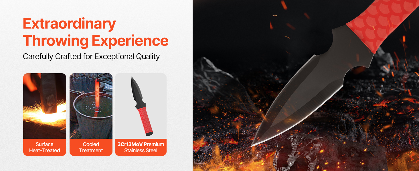 Naše vrhací nože s pouzdrem jsou vyrobeny z odolné nerezové oceli 3Cr13 s tepelně upraveným nebo černěným povrchem. Jsou odolné proti opotřebení, korozi a jsou vyrobeny tak, aby vydržely nekonečné množství hodů.