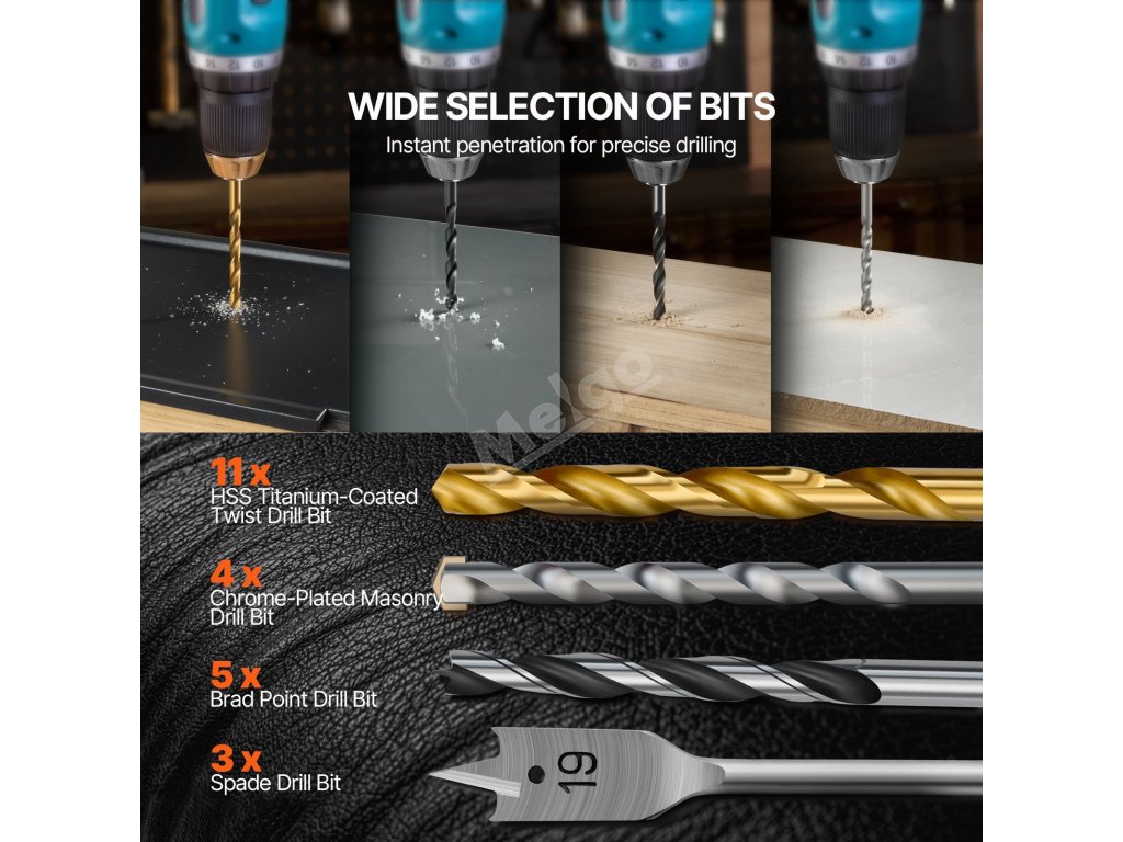 Tato kolekce obsahuje 23 ostrých a odolných vrtáků do kovu, zdiva, dřeva, plastu a dalších materiálů, takže najdete přesně tu velikost, kterou potřebujete pro každou práci.