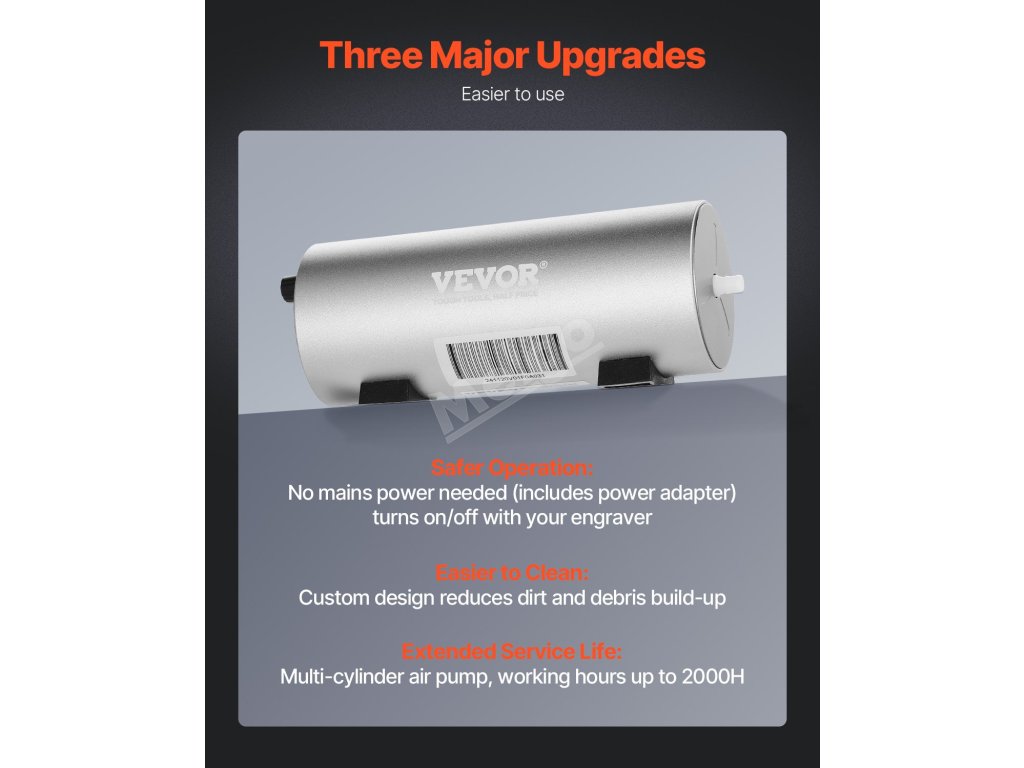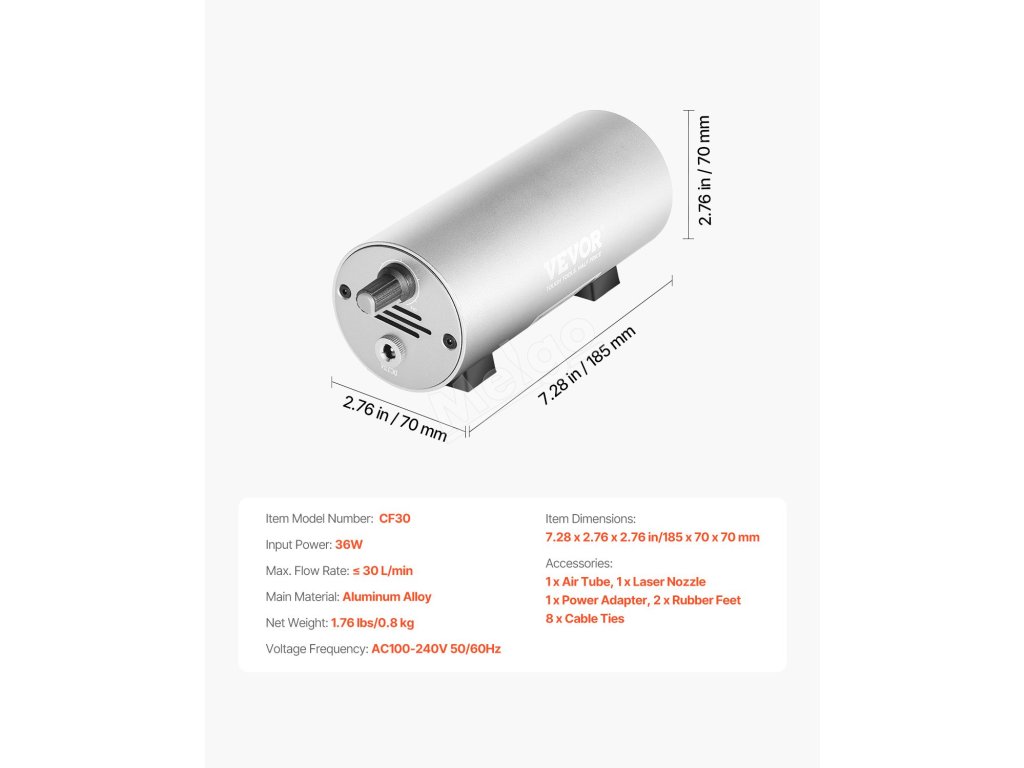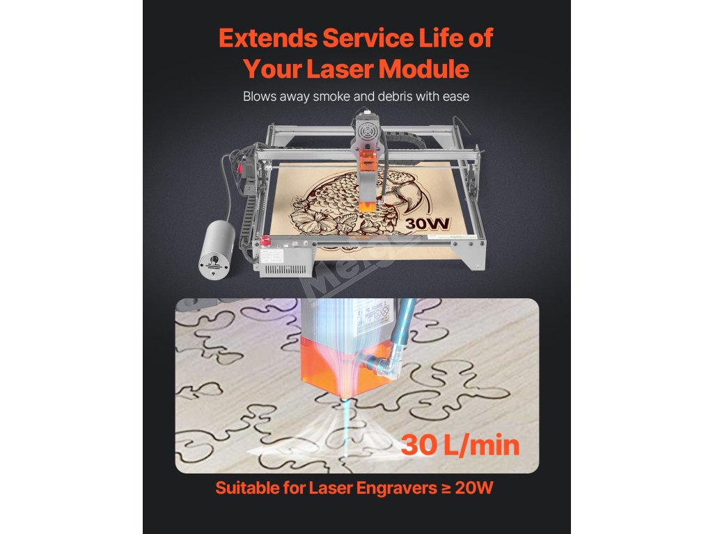 Toto vzduchové čerpadlo snadno odfoukne kouř a nečistoty a prodlouží životnost laserového modulu. Nastavitelný průtok vzduchu 30 l/min snižuje teplotu povrchu a zajišťuje čistý řezný okraj. Kompatibilní s gravírovacími stroji VEVOR a jinými značkami ≥ 20 W. Vhodné pro všechny vaše gravírovací práce.