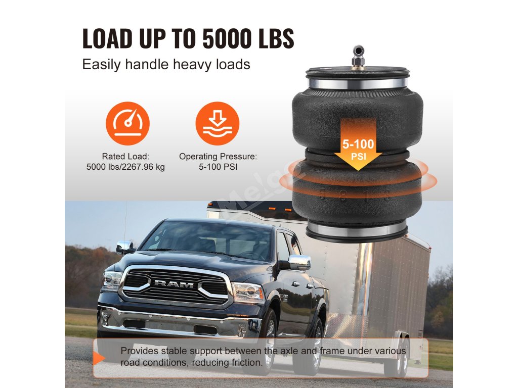 Sada vzduchového odpružení, která unese až 5 000 kg, poskytuje oporu mezi nápravami a rámem, čímž snižuje riziko propadnutí. Pružné vzduchové pružiny pracují v rozsahu 5 až 100 psi.