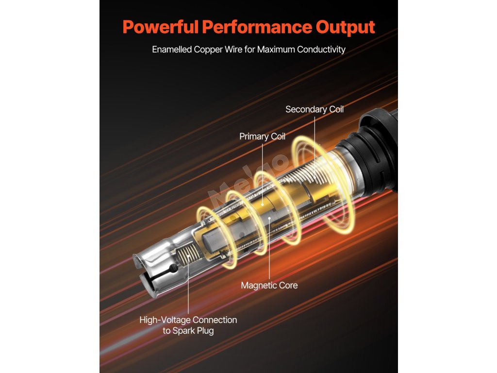 Zapalovací cívka využívá vysoce účinný systém přeměny energie, který transformuje nízkonapěťovou elektrickou energii na vysokonapěťové jiskry, čímž zlepšuje účinnost spalování, snižuje energetické ztráty a zajišťuje rychlou odezvu. Tím se optimalizuje celkový výkon motoru.