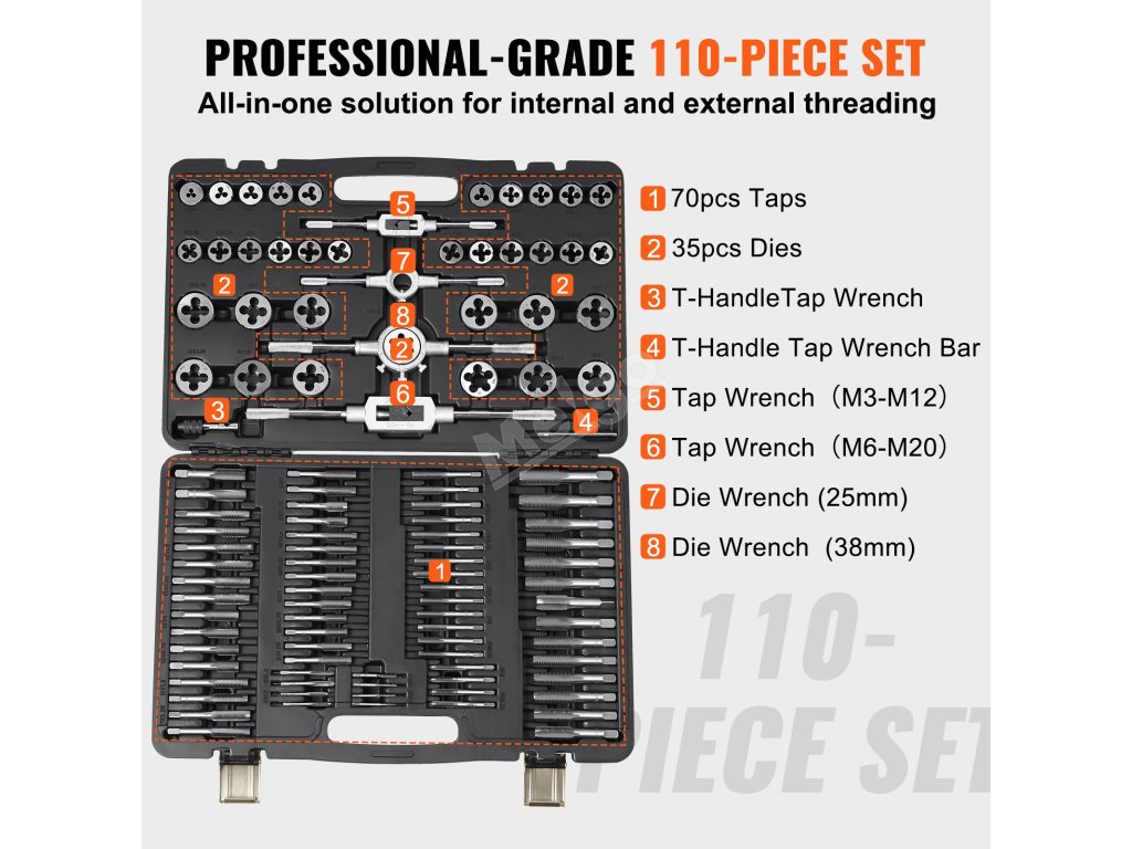 Profesionální 110dílná sada závitníků a matric, která obsahuje 35 kusů závitníků různých velikostí, 35 kusů zástrčných závitníků, 35 kusů matric, 2 kusy závitových klíčů, 2 kusy matricových klíčů a 1 kus závitového klíče typu T, vám pomůže efektivně provádět závitnické práce.