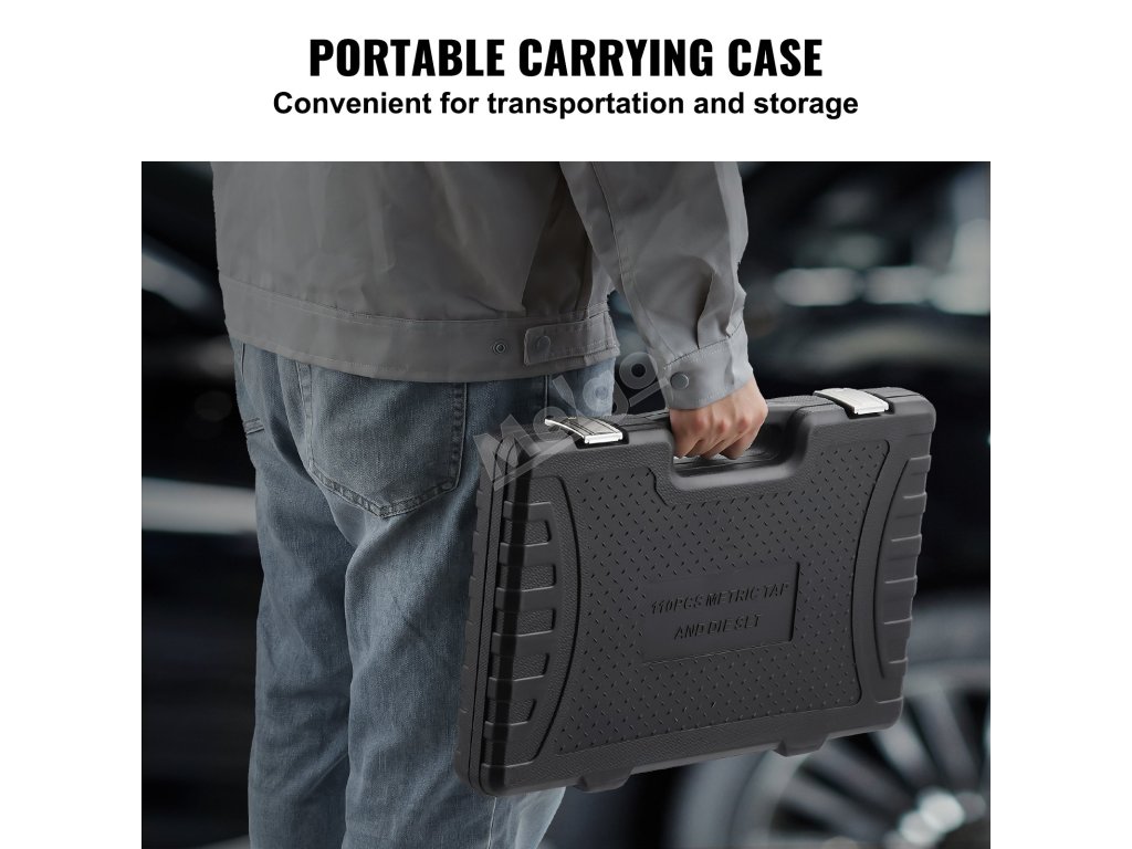 Naše sada metrických závitníků a matric je velmi pohodlná na přenášení, takže ji můžete použít kdykoli a kdekoli. Přenosný kufřík poskytuje vynikající úložný prostor pro vaše nástroje, které tak budete mít uspořádané na jednom místě a vyhnete se problémům se ztracenými nebo ztracenými nástroji.