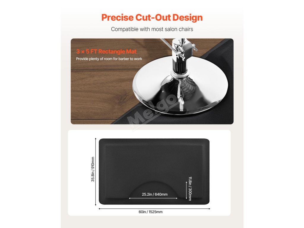 Naše obdélníková podložka pod křeslo v salonu o rozměrech 1525 x 910 mm nabízí prostornou plochu pro stání, která holičům umožňuje volnou a pohodlnou práci. A výřez o rozměrech 640 x 300 mm (25,2 x 11,8 palce) je vhodný pro většinu salonních křesel s kulatou základnou. (Před objednáním si prosím změřte základnu židle, abyste se ujistili, že sedí)