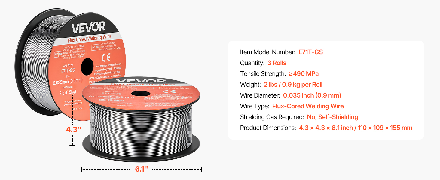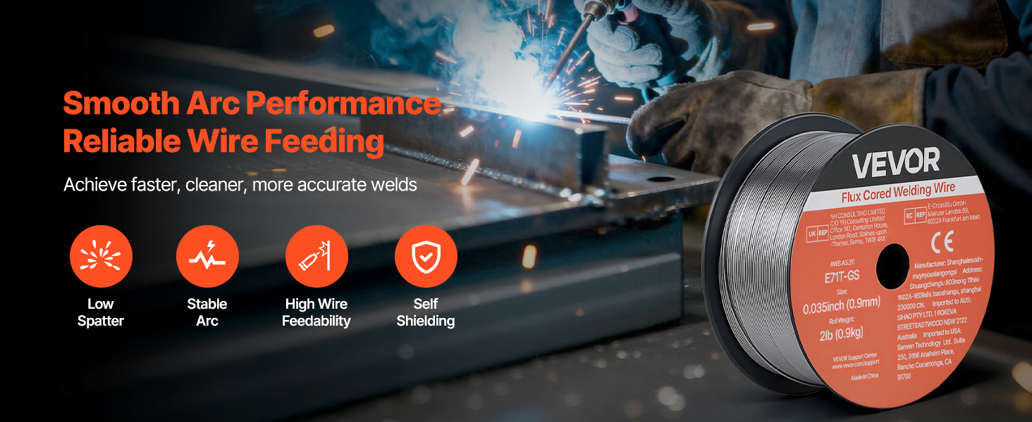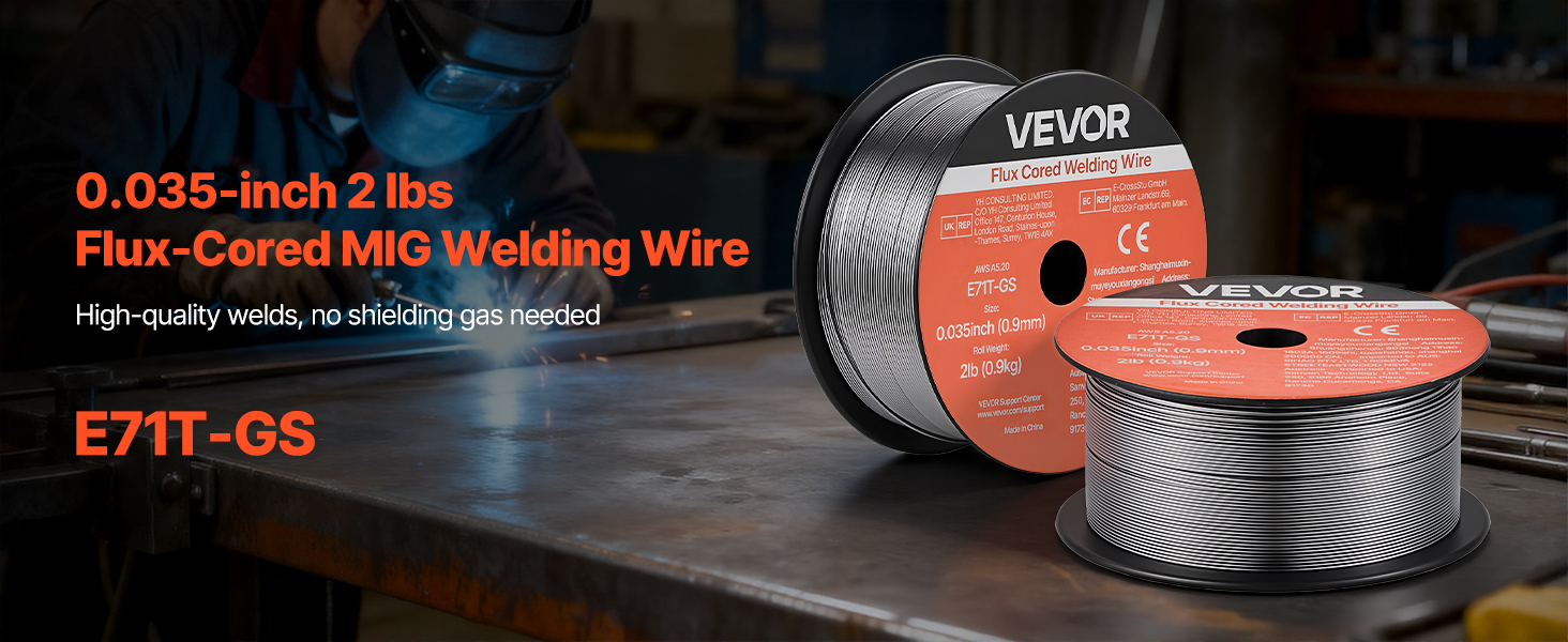 Svařovací drát VEVOR 0,035" 2 lbs E71T-GS pro svařování metodou MIG s tavidlem poskytuje pevné a konzistentní svary s hladkým posuvem drátu, nízkým rozstřikem a samostíněním. Podporuje svařování bez plynu ve všech polohách a vysokou pevnost v tahu pro spolehlivý výkon v automobilovém průmyslu, strojírenství a při svařování pro kutily.
