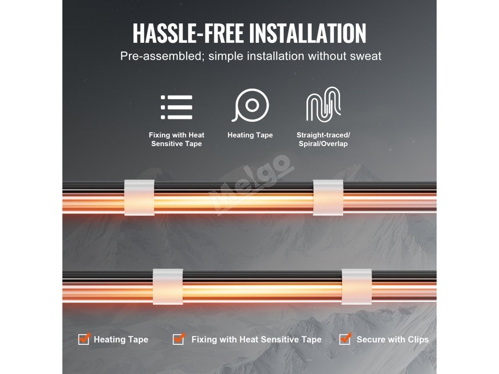 Tento topný kabel do potrubí je vybaven pokročilou samoregulační technologií, která automaticky upravuje topný výkon v závislosti na okolní teplotě. Díky vestavěnému termostatu se automaticky zapne při teplotě 43℉ / 6 ℃ a přestane pracovat při teplotě 55℉ / 13 ℃, čímž odpadá nutnost neustálého sledování.