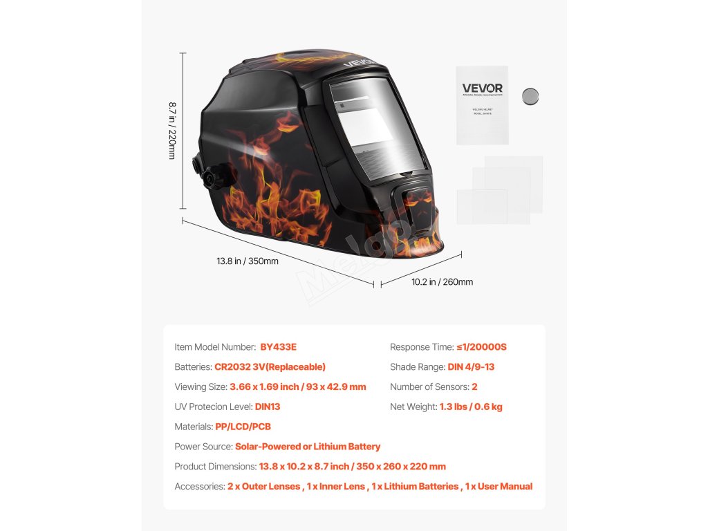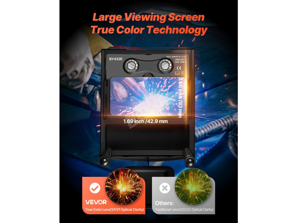 Tato svářečská helma VEVOR s automatickým stmíváním má široký rozsah odstínů DIN 4/9-13, technologii věrných barev a 2 obloukové senzory, které zajišťují jasnější a přirozenější vzhled. Účinně filtruje škodlivé světlo, snižuje únavu očí a zvyšuje bezpečnost broušení a svařování.