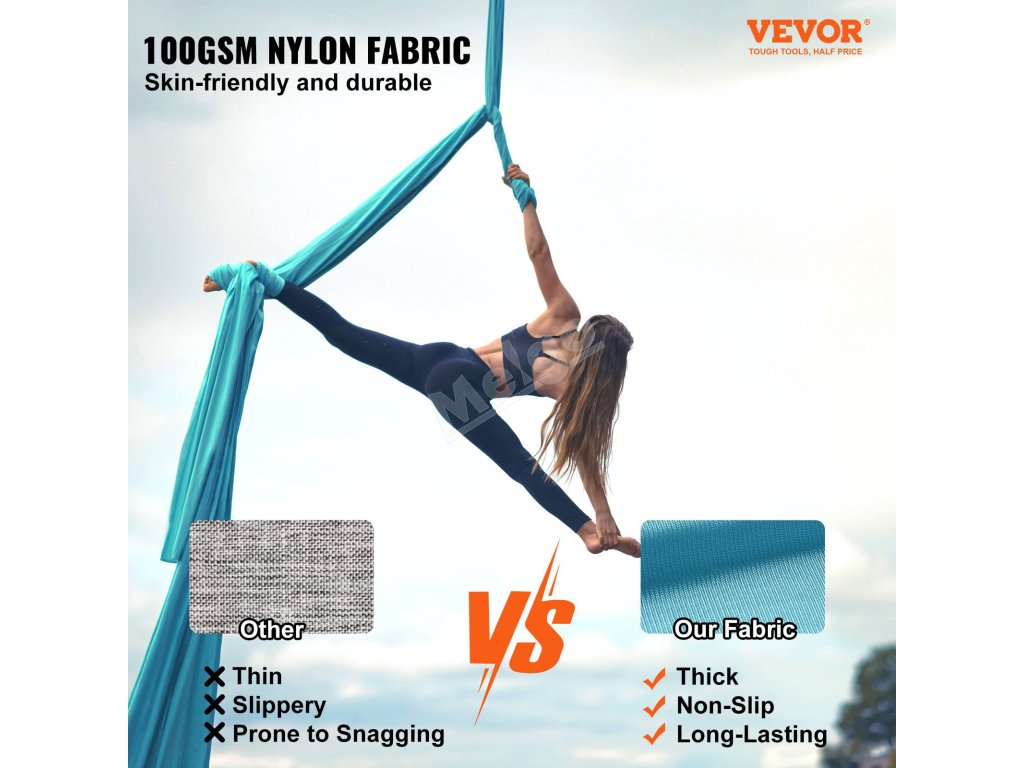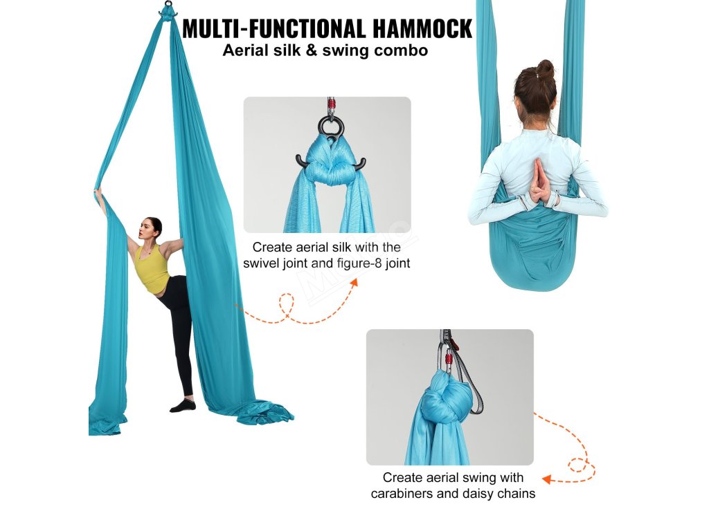 Naše vzdušné hedvábí má velkorysé rozměry, takže je vhodné do různých prostor, ať už doma, nebo v profesionálním studiu. Rozvíjejte svůj jógový potenciál s každým otočením a protažením.