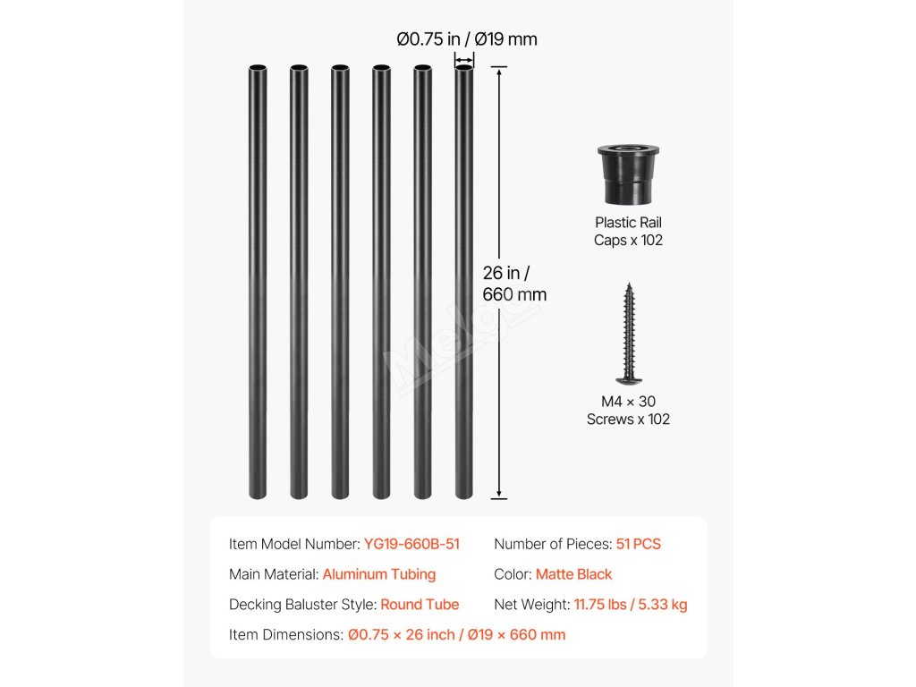 | Rozmery položky | ø0,75 x 26 palcov / Ø19 x 660 mm (každý) |