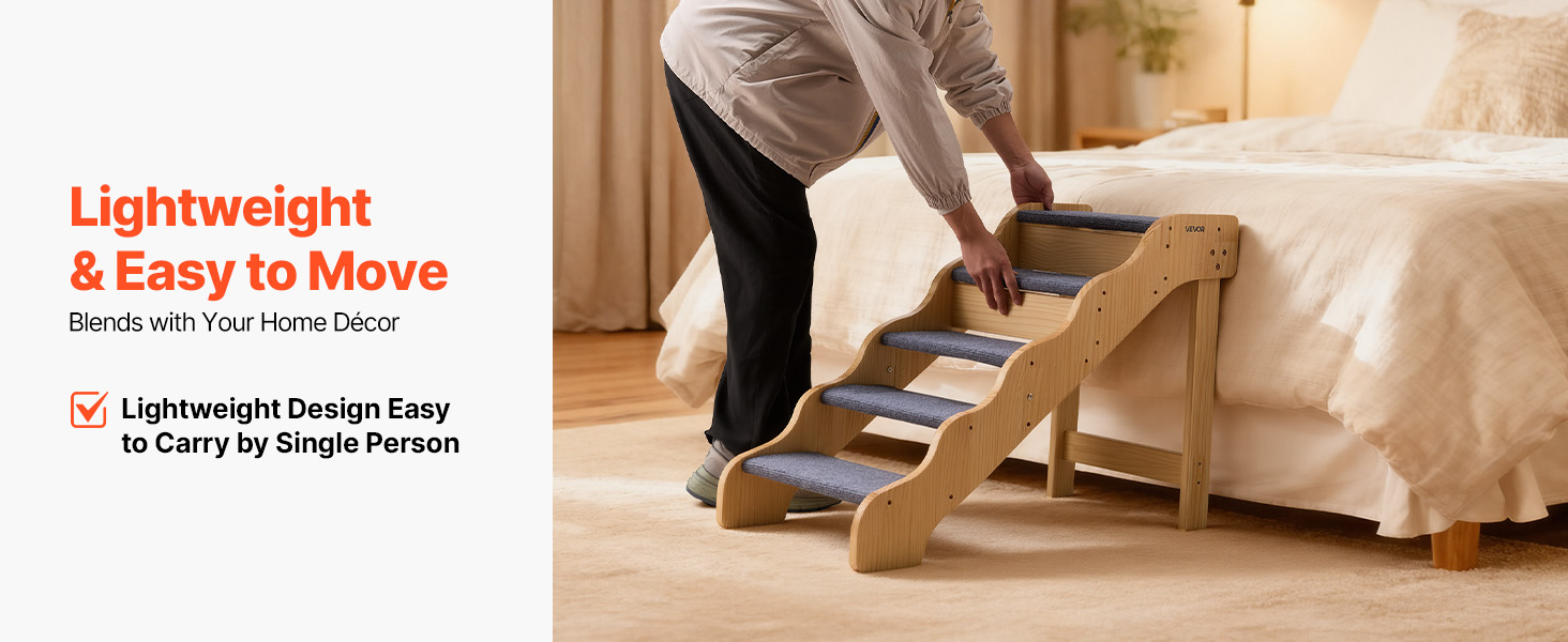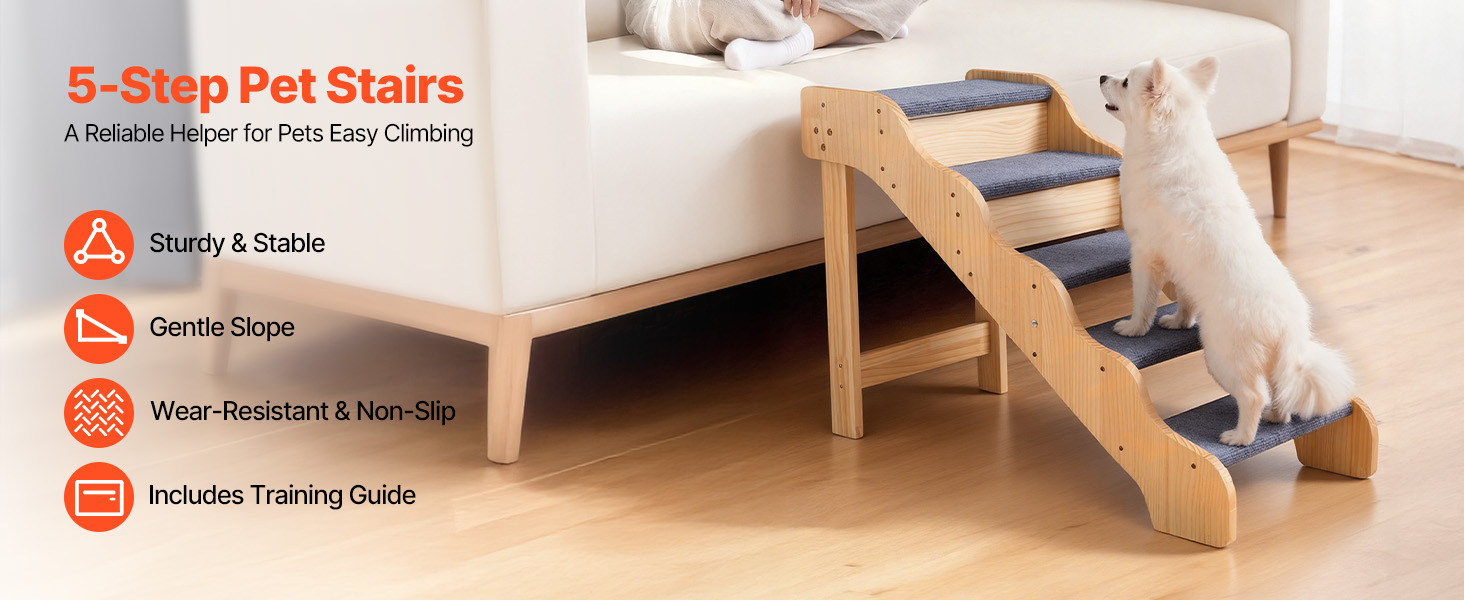 pětistupňová konstrukce pomáhá domácím mazlíčkům všech velikostí, zejména starším, zraněným nebo pohybově postiženým, bezpečně se dostat na postele a pohovky. Robustní konstrukce poskytuje oporu, zatímco lehká konstrukce usnadňuje přemisťování. Jeho čistý, jednoduchý design se dokonale hodí do každého interiéru.