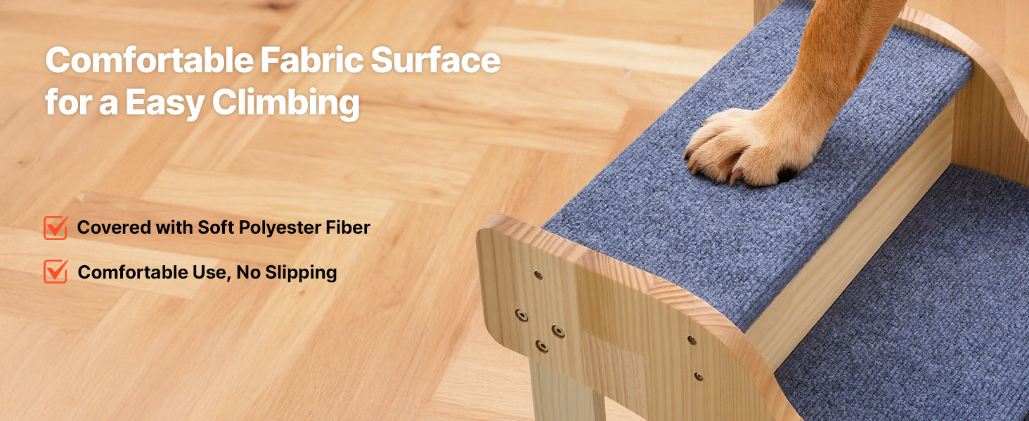 Tyto schůdky do pelíšku pro psy mají schůdky potažené látkou, které zajišťují lepší přilnavost tlapek a měkčí povrch, který pomáhá předcházet uklouznutí a zranění domácích mazlíčků.