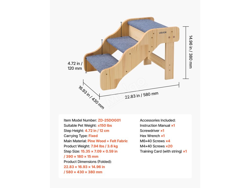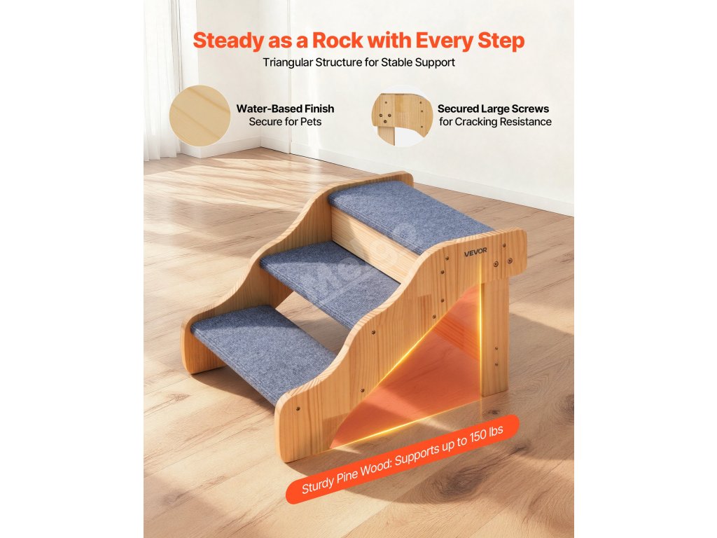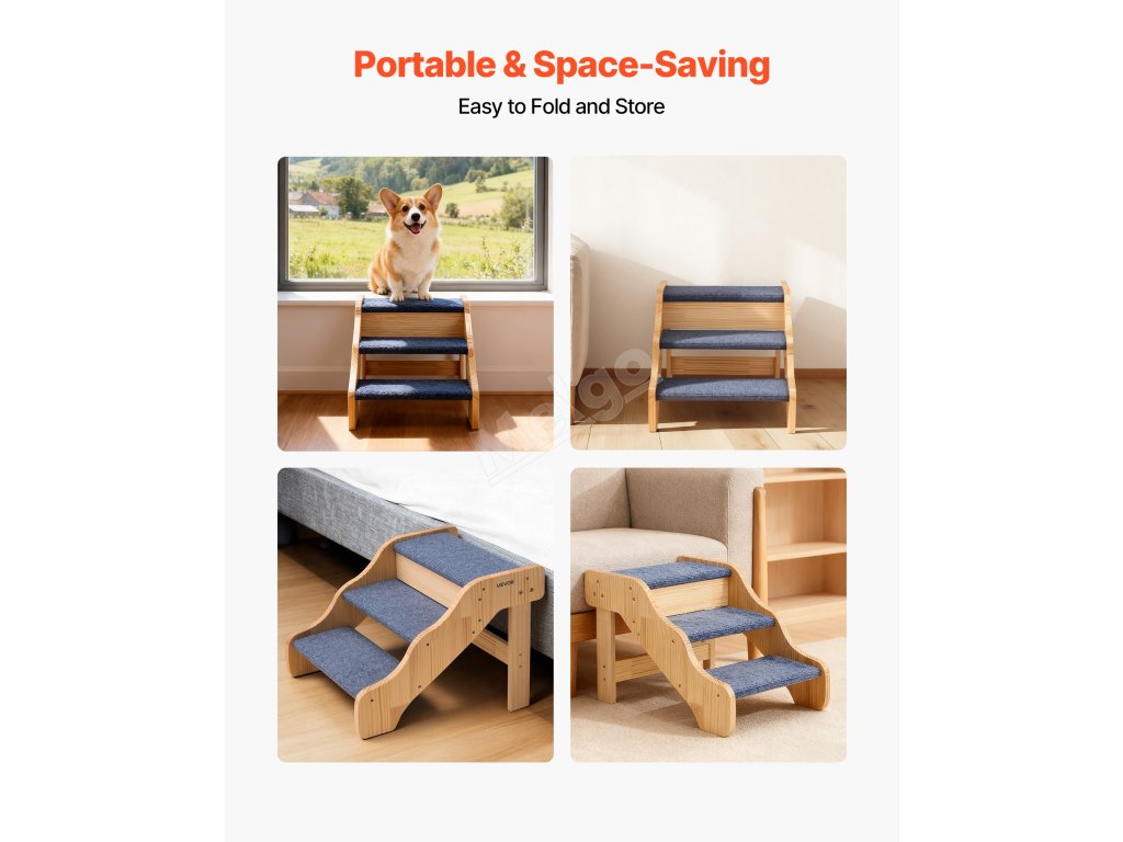 třípatrová konstrukce pomáhá domácím mazlíčkům všech velikostí, zejména starším, zraněným nebo pohybově postiženým, bezpečně se dostat na postele a pohovky. Robustní konstrukce poskytuje oporu, zatímco lehká konstrukce usnadňuje přemisťování. Jeho čistý, jednoduchý design se dokonale hodí do každého interiéru.